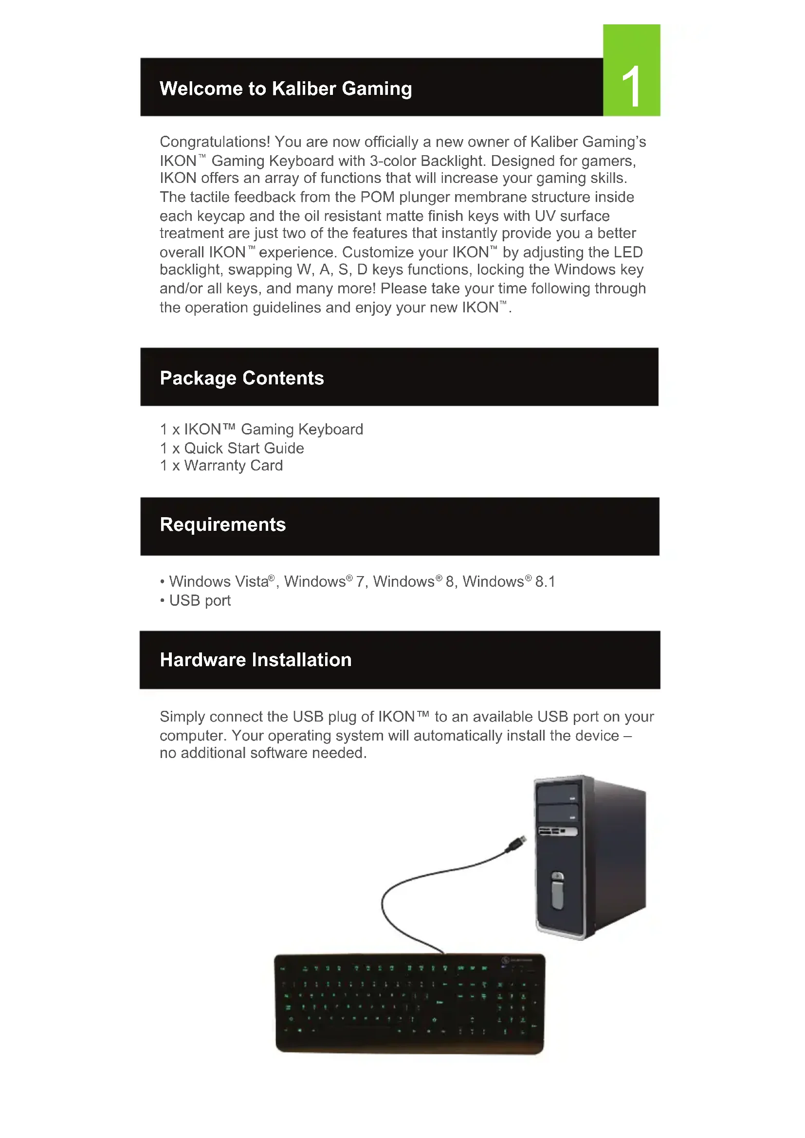 Vör Teclado para juegos Quick Start Guide TMSimply connect the USB plug of IKON™ to an available USB port on your computer. Your operating system will automatically install the device – no additional software needed. Welcome to Kaliber Gaming Congratulations! You are now officially a new owner of Kaliber Gaming’s IKON