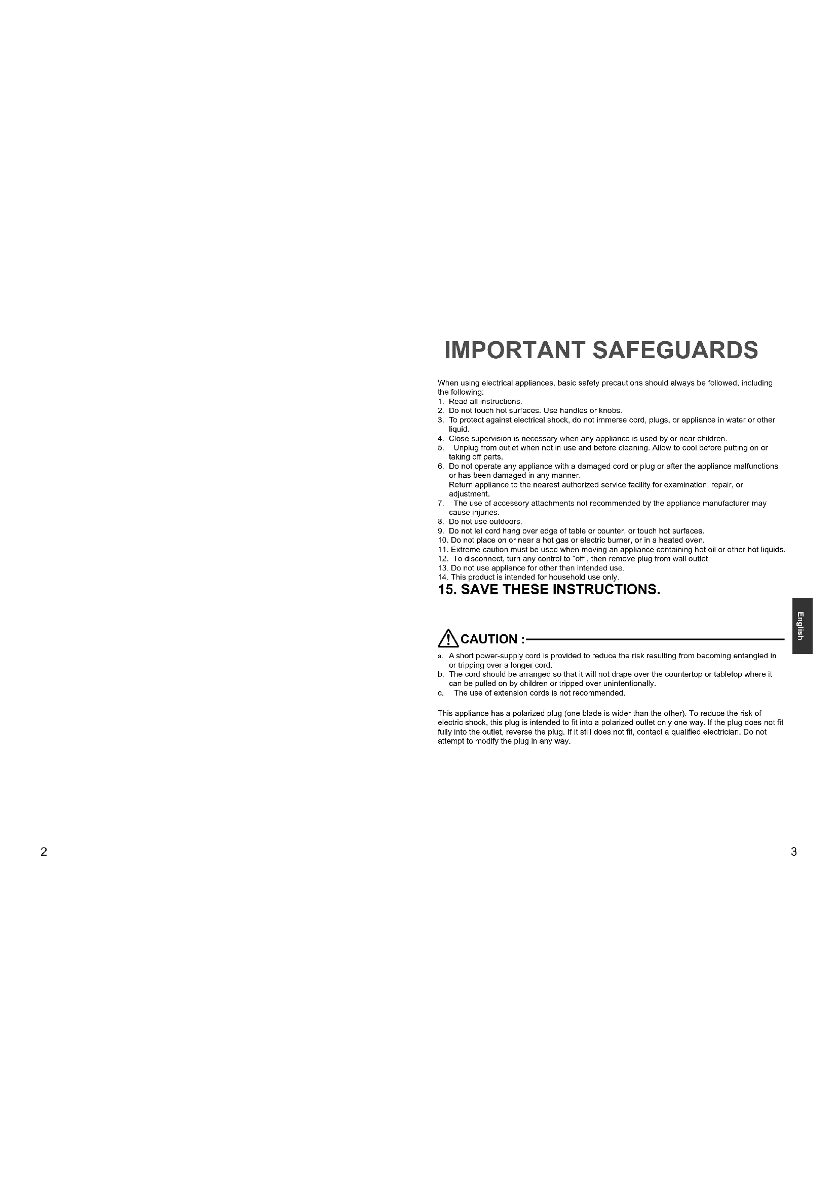 English IMPORTANT SAFEGUARDS When using electrical appliances, basic safety precautions should always be followed, including the following: