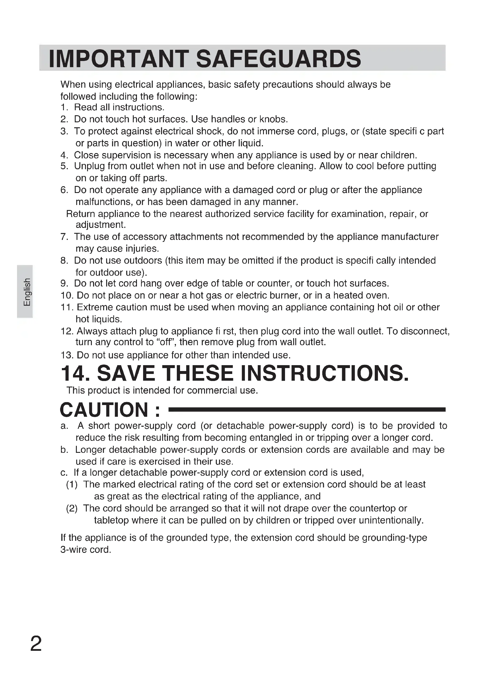 This product is intended for commercial use. a. A short power-supply cord (or detachable power-supply cord) is to be provided to reduce the risk resulting from becoming entangled in or tripping over a longer cord. b. Longer detachable power-supply cords or extension cords are available and may be used if care is exercised in their use. c. If a longer detachable power-supply cord or extension cord is used, (1) The marked electrical rating of the cord set or extension cord should be at least as great as the electrical rating of the appliance, and (2) The cord should be arranged so that it will not drape over the countertop or tabletop where it can be pulled on by children or tripped over unintentionally. If the appliance is of the grounded type, the extension cord should be grounding-type 3-wire cord. CAUTION : SR-GA721_EN-USA.indd 2SR-GA721_EN-USA.indd 2 10/26/07 9:11:43 AM10/26/07 9:11:43 AM3 English This sign means prohibited action. This sign means required action.