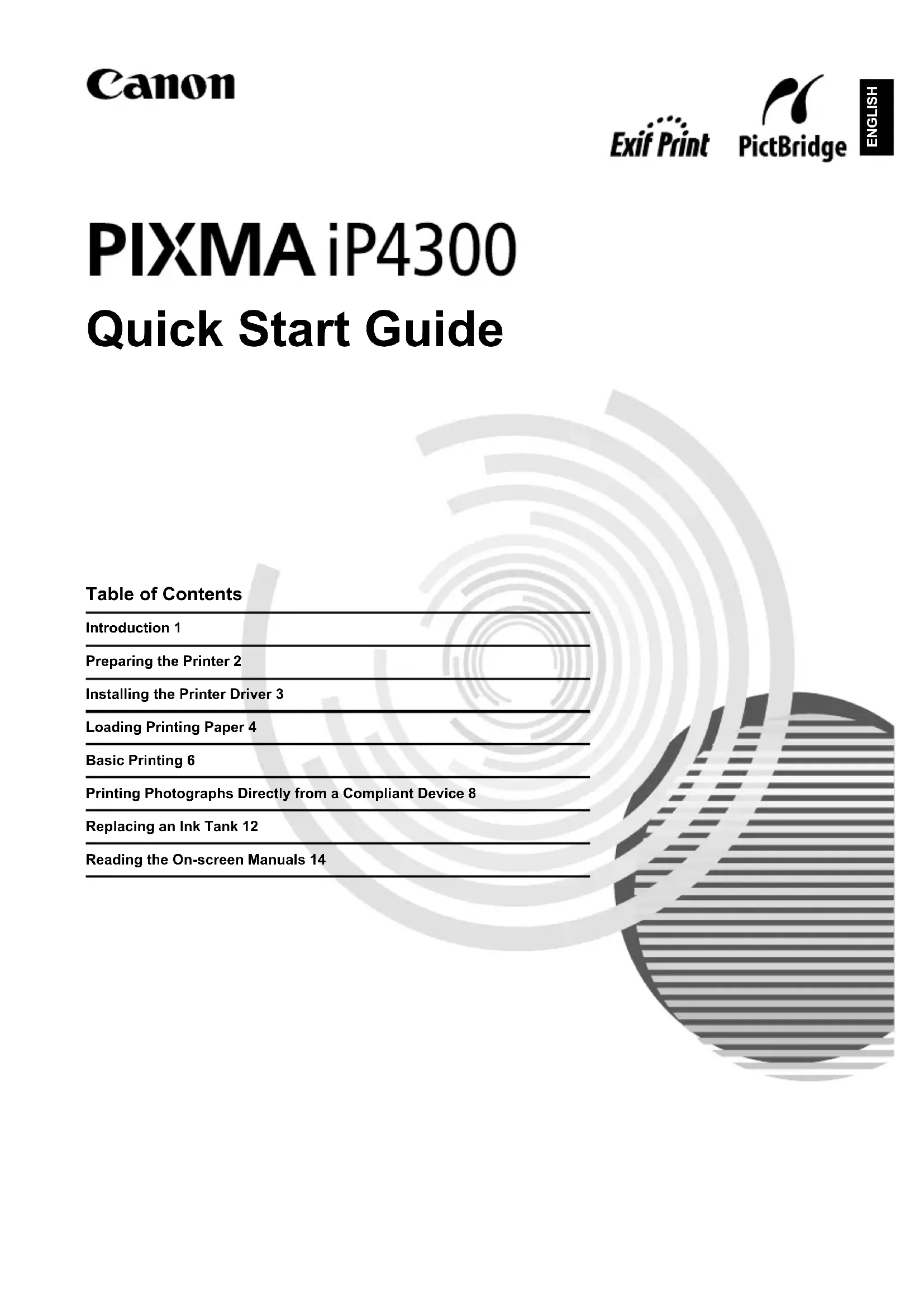 Office Equipment Program is a global program that promotes energy saving through the use of computer and other office equipment. The program backs the development and dissemination of products with functions that effectively reduce energy consumption. It is an open system in which business can participate voluntarily. The targeted products are office equipment such as computers, monitors, printers, faxes and copiers. Their standards and logos are uniform among participating nations. Power Requirements Never use a power supply voltage other than that supplied in the country of purchase. Using the incorrect voltage could cause a fire or electric shock. The correct power supply voltages and frequencies are as follows: AC 100-240 V, 50/60 Hz About Consumables Consumables (ink tanks / FINE Cartridges) are available for 5 years after production has stopped. Safety Precautions Warning z Never attempt to plug the power cord into the power outlet or unplug the power cord when your hands are wet. z Never damage, modify, stretch, or excessively bend or twist the power cord. Do not place heavy objects on the power cord. z Never use any power supply other than the standard power supply available in the country of purchase. Using the incorrect voltage and frequency could cause a fire or electric shock.z Always push the plug all the way into the power outlet. Caution z For safety reasons, store ink tanks out of the reach of small children. z Do not drop or shake ink tanks as this may cause the ink to leak out and stain your clothes and hands. Also read the Safety Precautions in the User’s Guide on-screen manual. Observe the warnings and cautions to avoid personal injury or damage to the printer. Model Number: K10284 (iP4300)1Introduction ENGLISH Introduction Thank you for purchasing a Canon Inkjet Printer. This Quick Start Guide uses the following symbols to indicate important information. Always observe the instructions indicated by these symbols. Warning Instructions that, if ignored, could result in death or serious personal injury caused by incorrect operation of the equipment. These must be observed for safe operation. Caution Instructions that, if ignored, could result in personal injury or material damage caused by incorrect operation of the equipment. These must be observed for safe operation. Important Instructions that must be observed for safe operation. Trademark Notices z “Windows” and “Internet Explorer” are trademarks of Microsoft Corporation, registered in the United States and other countries. z “Macintosh” and “Mac” are trademarks of Apple Computer, Inc., registered in the U.S. and other countries. z “Adobe” and “Adobe RGB (1998)” are either registered trademarks or trademarks of Adobe Systems Incorporated in the United States and/or other countries. Copyright ©2006 CANON INC. All rights reserved. No part of this publication may be transmitted or copied in any form whatsoever without the express written permission.2 Preparing the Printer ENGLISH Preparing the Printer Be sure to read your setup sheet first for setting up your printer and getting it ready for use. 1 Turn on the printer. 2 Install the Print Head. 3 Install the ink tanks. 4 Load printing paper. In the following process, you will be required to perform the Print Head Alignment, and you will need a sheet of A4 or Letter-sized plain paper loaded in the Auto Sheet Feeder. Caution Be sure to remove the tapes before you turn on the printer. Note The tape position is subject to change. Caution Do not touch internal parts other than the Print Head Lock Lever. Important If the Top Cover is open for more than 10 minutes, the Print Head Holder moves to the right side. In this case, close the Top Cover, and open it again. Note z There might be some transparent or light blue ink on the inside of the bag the print head comes in, or the inside of the protective cap - this has no effect on print quality. Be careful not to get ink on yourself when handling these items.z Do not reattach the protective cap once it has been removed. Important z Make sure that all the ink tanks are installed in the correct position, matching the label. The printer cannot be used unless all the ink tanks are installed. z Once you have installed the ink tanks, the POWER lamp will flash green. Wait for about 2 minutes, until the POWER lamp stops flashing and changes to steady, non-flashing green and the printer has stopped making operating noises, before proceeding. Note z Be sure to remove the clear film from the ink tank in the exact order as shown in step 3 of your setup sheet. z Do not squeeze the side of ink tanks as this may cause the ink to leak out and stain your clothes and hands.z Do not reattach the protective cap once you have removed it. z The ALARM lamp on the printer still flashes orange if an ink tank is not installed properly. Open the Top Cover and make sure that position of all the ink tanks match the label. Important z When loading paper in the Auto Sheet Feeder, make sure that the Auto Sheet Feeder lamp is lit. z Always load paper in portrait orientation. Loading paper in landscape orientation can cause the paper to be jammed.3Installing the Printer Driver ENGLISH Installing the Printer Driver Information Common to Windows