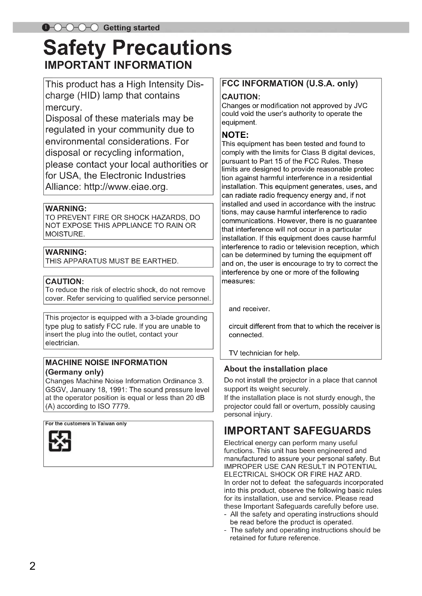 Getting started Safety Precautions IMPORTANT INFORMATION This product has a High Intensity Dis- charge (HID) lamp that contains mercury. Disposal of these materials may be regulated in your community due to environmental considerations. For disposal or recycling information, please contact your local authorities or for USA, the Electronic Industries Alliance: http://www.eiae.org. FCC INFORMATION (U.S.A. only) CAUTION: could void the user’s authority to operate the equipment. NOTE: This equipment has been tested and found to comply with the limits for Class B digital devices, pursuant to Part 15 of the FCC Rules. Theselimits are designed to provide reasonable protection against harmful interference in a residential installation. This equipment generates, uses, andcan radiate radio frequency energy and, if not installed and used in accordance with the instructions, may cause harmful interference to radio communications. However, there is no guarantee that interference will not occur in a particular installation. If this equipment does cause harmful interference to radio or television reception, whichcan be determined by turning the equipment off and on, the user is encourage to try to correct the interference by one or more of the following measures:● Reorient or relocate the receiving antenna.● Increase the separation between the equipment and receiver.● Connect the equipment into an outlet on a circuit different from that to which the receiver is connected.● Consult the dealer or an experienced radio/