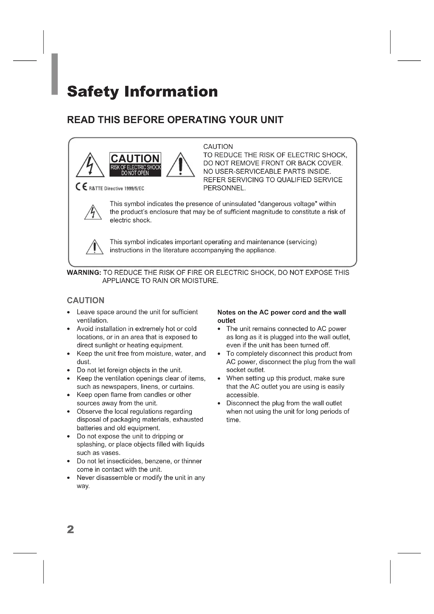 Disconnect the plug from the wall outlet when not using the unit for long periods of time.Safety Information English