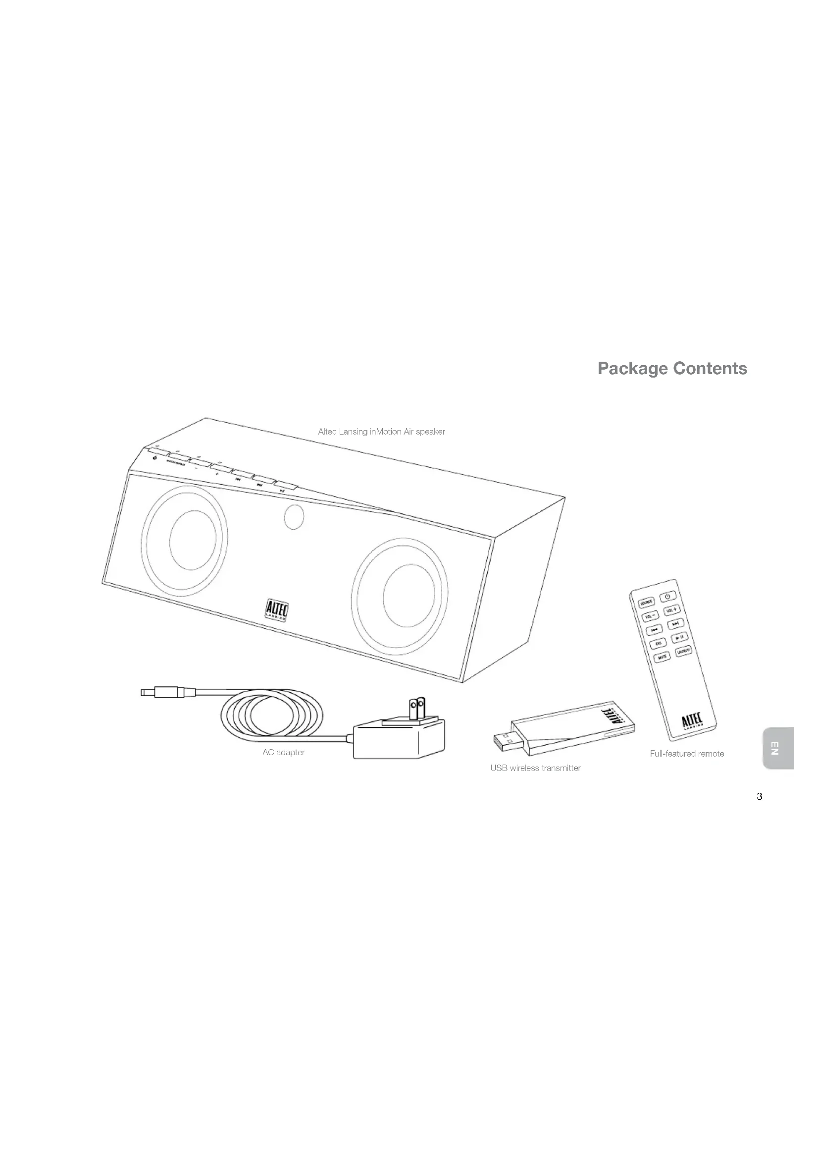 Package Contents AC adapter Full-featured remote Altec Lansing inMotion Air speaker USB wireless transmitter4 Speaker Features and Indicators Track back button Volume increase button Bluetooth status LED Play/pause button Bluetooth source LED Auxiliary input LED Power LED Source selection and pairing button Volume decrease button Track forward button Input jack for AC adapter Auxiliary jack for non-Bluetooth-Enabled music players Shipping and long-term storage switch Power on/off button5