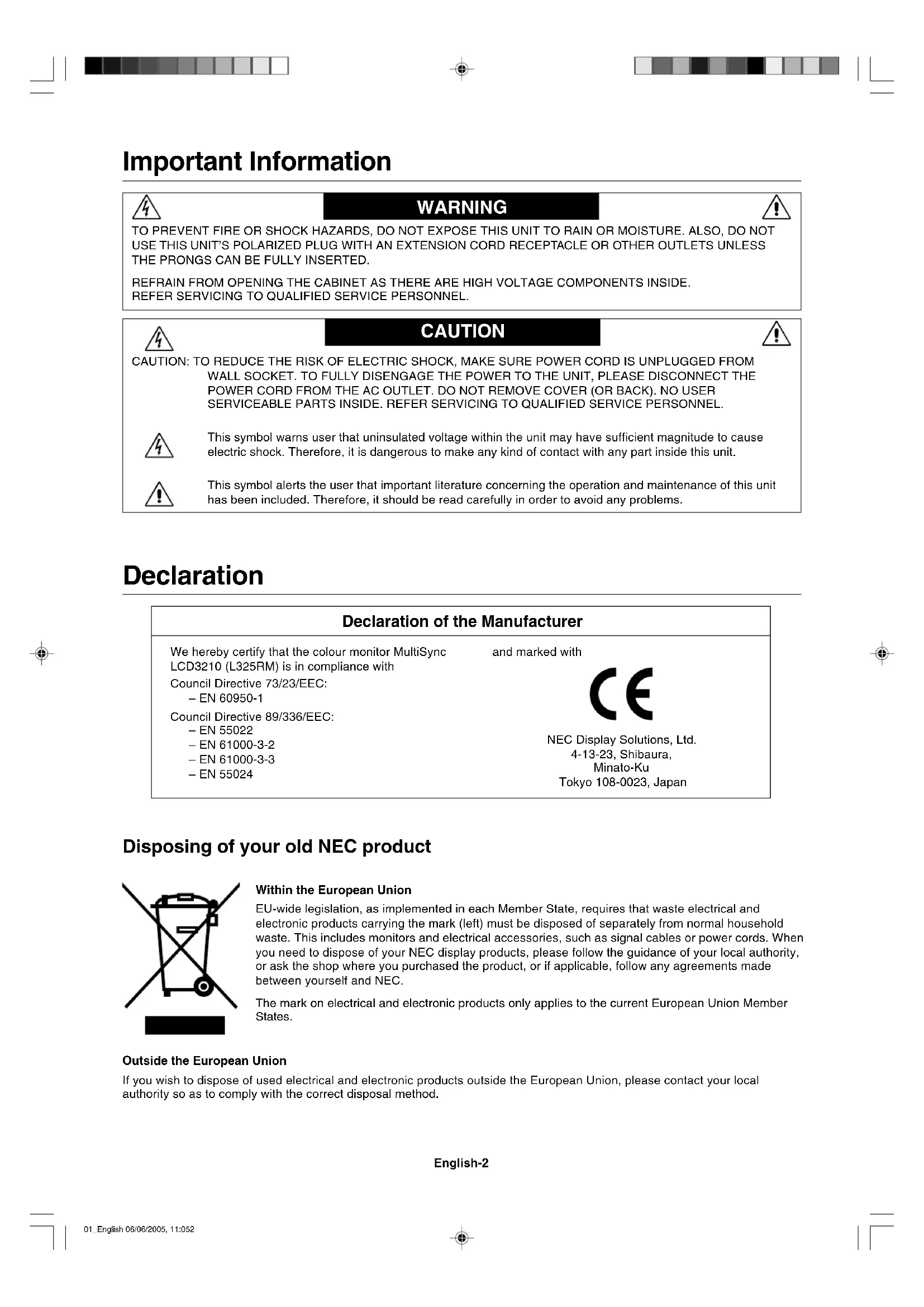 MultiSync LCD3210 40" LCD Colour Monitor User’s Manual UÏivatelská pfiíruãka Bedienerhandbuch Οδηγίες Χρήσης Manual del usuario Manuel Utilisateur Manuale utente Gebruikershandleiding Podr´cznik u˝ytkownika Руководство пользователя Kullan∂c∂ Klavuzu 00_Cover_all 06/06/2005, 11:051DECLARATION OF CONFORMITY This device complies with Part 15 of FCC Rules. Operation is subject to the following two conditions. (1) This device may not cause harmful interference, and (2) this device must accept any interference received, including interference that may cause undesired operation. U.S. Responsible Party: NEC Display Solutions of America, Inc. Address: 500 Park Boulevard, Suite 1100 Itasca, Illinois 60143 Tel. No.: (630) 467-3000 Type of Product: Computer Monitor Equipment Classification: Class B Peripheral Model: MultiSync LCD3210 (L325RM) We hereby declare that the equipment specified above conforms to the technical standards as specified in the FCC Rules. Windows is a registered trademark of Microsoft Corporation. NEC is a registered trademark of NEC Corporation. All other brands and product names are trademarks or registered trademarks of their respective owners. Canadian Department of Communications Compliance Statement DOC: This Class B digital apparatus meets all requirements of the Canadian Interference-Causing Equipment Regulations. C-UL: Bears the C-UL Mark and is in compliance with Canadian Safety Regulations according to CAN/CSA C22.2 No. 60950-1. FCC Information 1. Use the attached specified cables with the MultiSync LCD3210 (L325RM) colour monitor so as not to interfere with radio and television reception. (1) Please use the supplied power cord or equivalent to ensure FCC compliance. (2) Please use the supplied shielded video signal cable, 15-pin mini D-SUB to 15-pin mini D-SUB. (3) Please attach the ferrite cores on the Audio Cable. Please see page 11 of this manual.