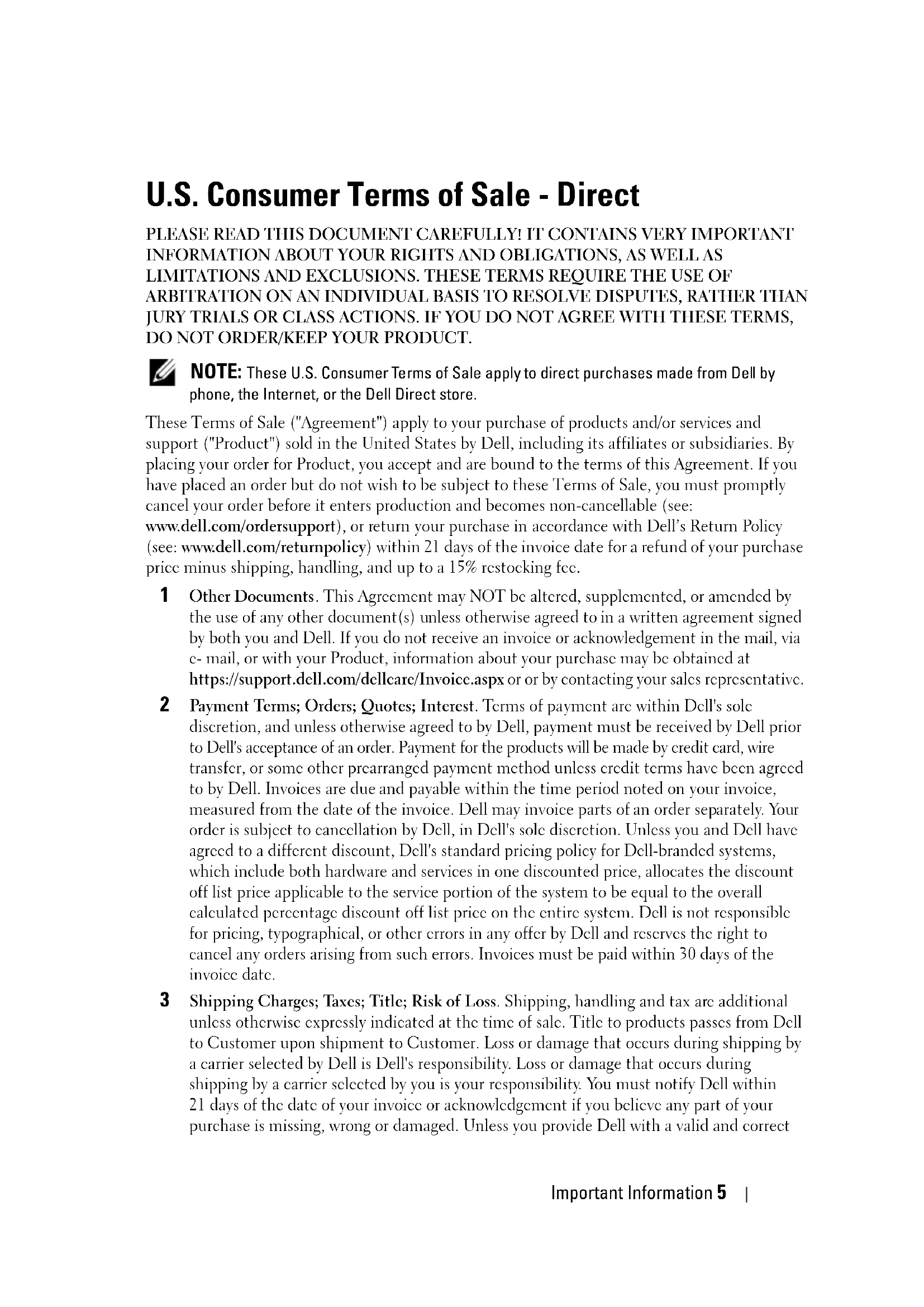 NOTICE TO COMMERCIAL CUSTOMERS: Purchases of products, software and services from Dell by Commercial customers (including Small, Medium and Large Business and Government and Public sector customers) are pursuant to Dell's Commercial Terms of Sale, available at www.dell.com/terms and incorporated by reference in its entirety herein. (Rev. 092611) U.S. Retail Purchaser End User Agreement PLEASE READ THIS DOCUMENT CAREFULLY! IT CONTAINS VERY IMPORTANT INFORMATION ABOUT YOUR RIGHTS AND OBLIGATIONS, AS WELL AS LIMITATIONS AND EXCLUSIONS. THESE TERMS REQUIRE THE USE OF ARBITRATION ON AN INDIVIDUAL BASIS TO RESOLVE DISPUTES, RATHER THAN JURY TRIALS OR CLASS ACTIONS. IF YOU DO NOT AGREE WITH THESE TERMS, DO NOT KEEP YOUR PRODUCT. This Retail Purchaser End User Agreement ("Agreement") governs your retail purchase and use of products and/or services and support ("Product") sold in the United States by Dell, including its affiliates or subsidiaries. BY PURCHASING AND USING THE PRODUCT, YOU ("CUSTOMER") AGREE TO BE BOUND BY THE TERMS OF THIS AGREEMENT. IF YOU DO NOT AGREE, DO NOT USE THE PRODUCT, AND RETURN THE PRODUCT TO YOUR PLACE OF PURCHASE (subject to its return policy). 1 Other Documents. This Agreement may NOT be altered, supplemented, or amended by the use of any other document(s) unless otherwise agreed to in a written agreement signed by both you and Dell.10 Important Information