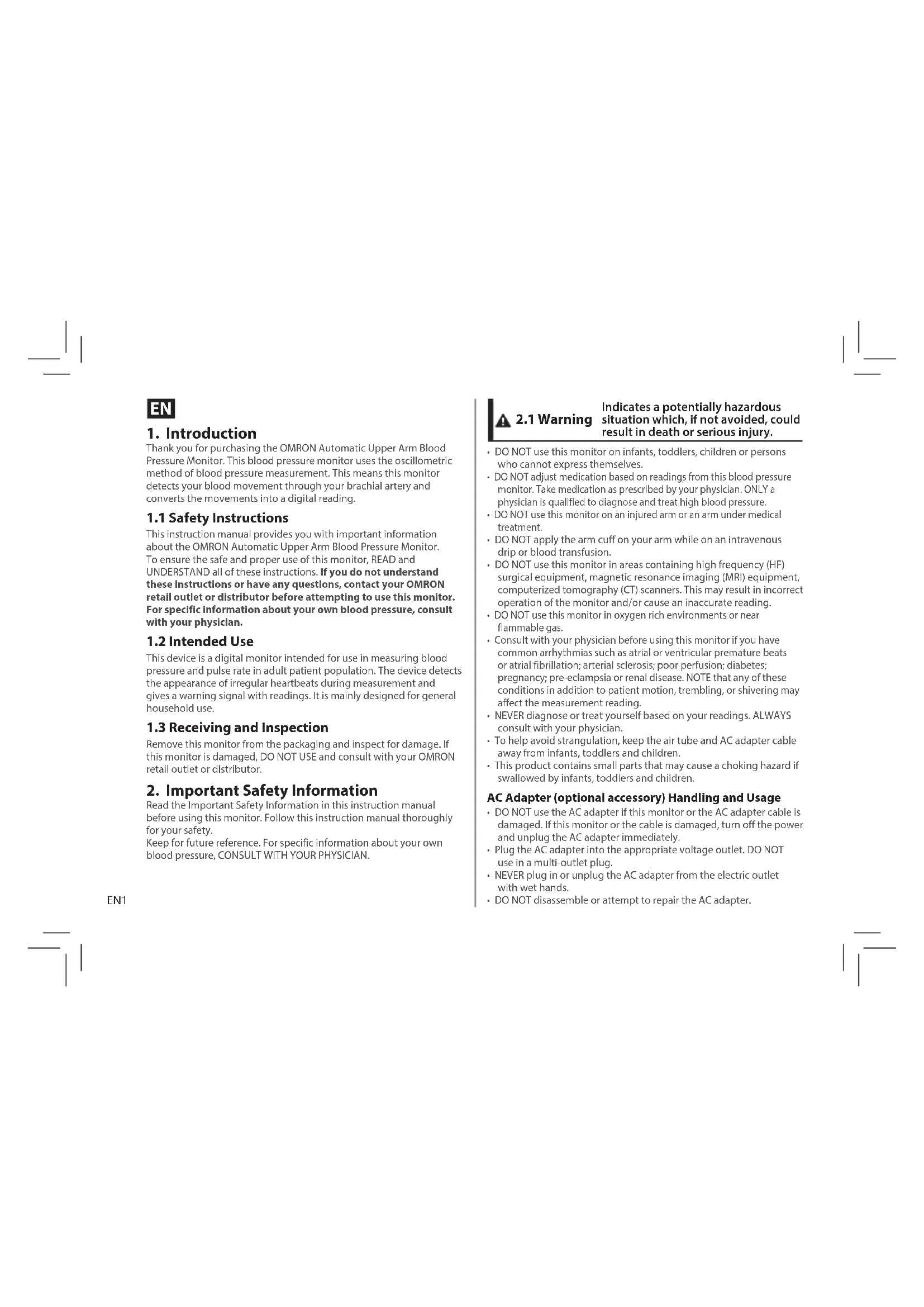 This instruction manual provides you with important information about the OMRON Automatic Upper Arm Blood Pressure Monitor. To ensure the safe and proper use of this monitor, READ and UNDERSTAND all of these instructions. If you do not understand these instructions or have any questions, contact your OMRON retail outlet or distributor before attempting to use this monitor. For specific information about your own blood pressure, consult with your physician.