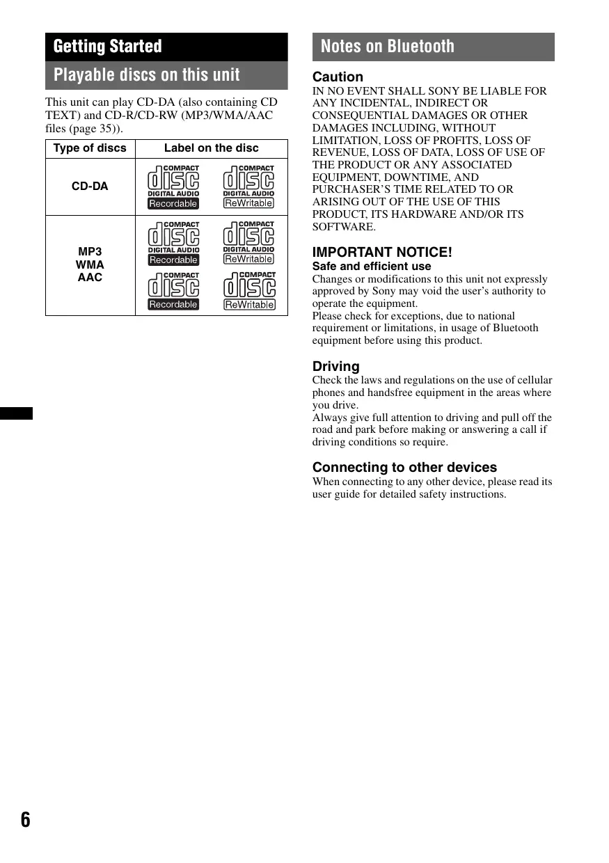 Getting Started Notes on Bluetooth Playable discs on this unit This unit can play CD-DA (also containing CD TEXT) and CD-R/CD-RW (MP3/WMA/AAC files (page 35)). Type of discs CD-DA MP3 WMA AAC Label on the disc Caution IN NO EVENT SHALL SONY BE LIABLE FOR
