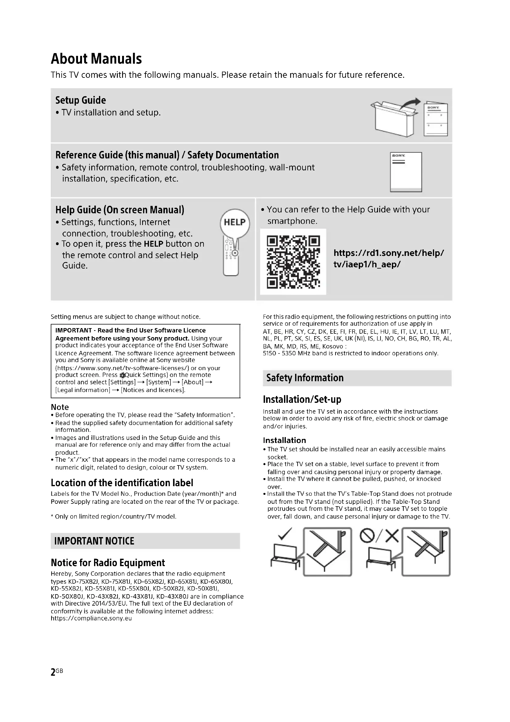 - Only on limited region/country/TV model. Notice for Radio Equipment Hereby, Sony Corporation declares that the radio equipment types KD-75X82J, KD-75X81J, KD-65X82J, KD-65X81J, KD-65X80J, KD-55X82J, KD-55X81J, KD-55X80J, KD-50X82J, KD-50X81J, KD-50X80J, KD-43X82J, KD-43X81J, KD-43X80J are in compliance with Directive 2014/53/EU. The full text of the EU declaration of conformity is available at the following internet address: https://compliance.sony.eu For this radio equipment, the following restrictions on putting into service or of requirements for authorization of use apply in AT, BE, HR, CY, CZ, DK, EE, FI, FR, DE, EL, HU, IE, IT, LV, LT, LU, MT, NL, PL, PT, SK, SI, ES, SE, UK, UK (NI), IS, LI, NO, CH, BG, RO, TR, AL, BA, MK, MD, RS, ME, Kosovo : 5150 - 5350 MHz band is restricted to indoor operations only. Installation/Set-up Install and use the TV set in accordance with the instructions below in order to avoid any risk of fire, electric shock or damage and/or injuries. Installation