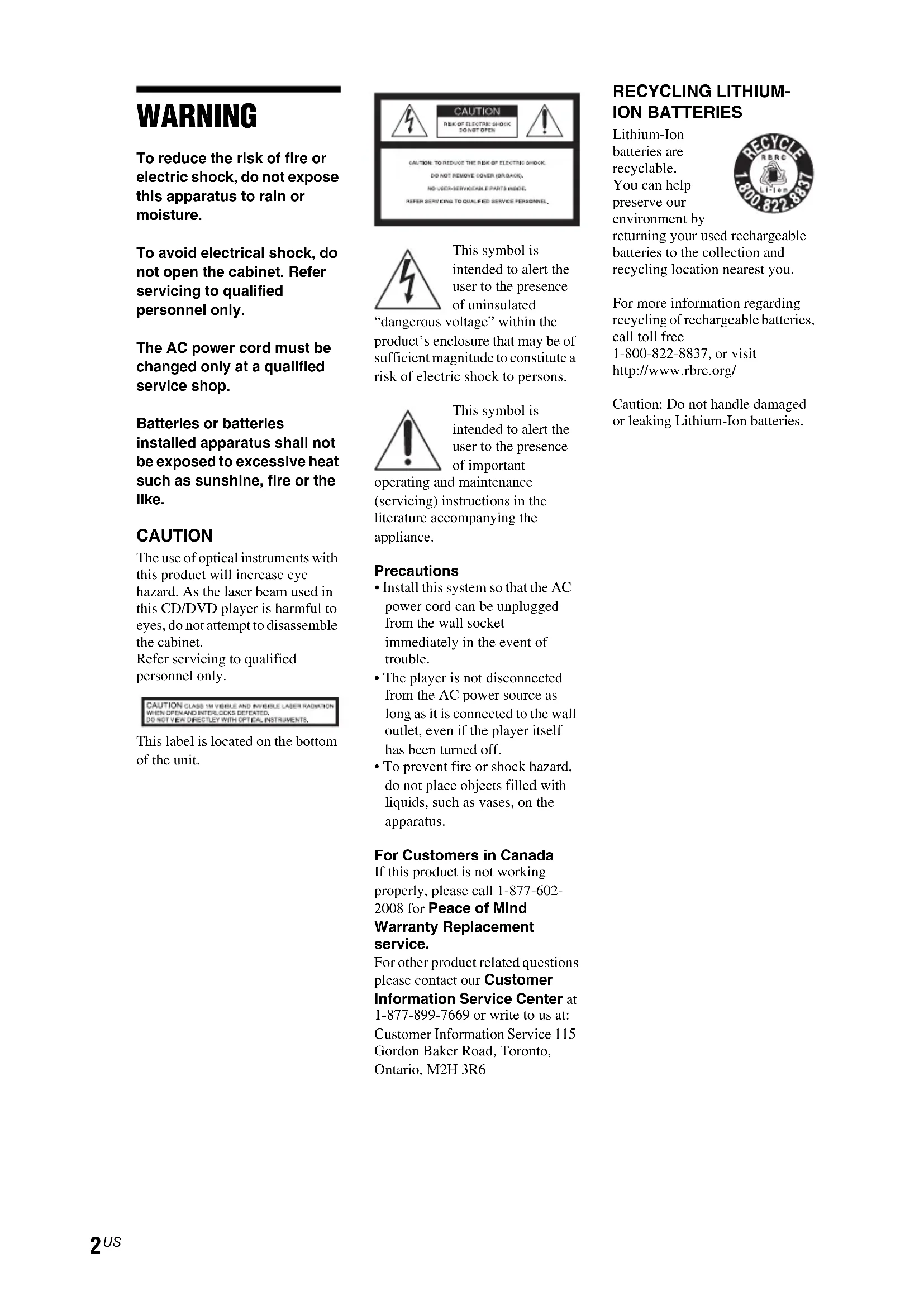 - To prevent fire or shock hazard, do not place objects filled with liquids, such as vases, on the apparatus. For Customers in Canada If this product is not working properly, please call 1-877-602- 2008 for Peace of Mind Warranty Replacement service. For other product related questions please contact our Customer Information Service Center at 1-877-899-7669 or write to us at: Customer Information Service 115 Gordon Baker Road, Toronto, Ontario, M2H 3R6 RECYCLING LITHIUM- ION BATTERIES Lithium-Ion batteries are recyclable. You can help preserve our environment by returning your used rechargeable batteries to the collection and recycling location nearest you. For more information regarding recycling of rechargeable batteries, call toll free 1-800-822-8837, or visit http://www.rbrc.org/ Caution: Do not handle damaged or leaking Lithium-Ion batteries. 01US01COV.book Page 2 Tuesday, January 15, 2008 12:01 PMC:\Documents and Settings\juliet_ma\Desktop\FX825_CA & FRC\English_final\FX825_GB\01US02WAR-CEK.fm master page=right