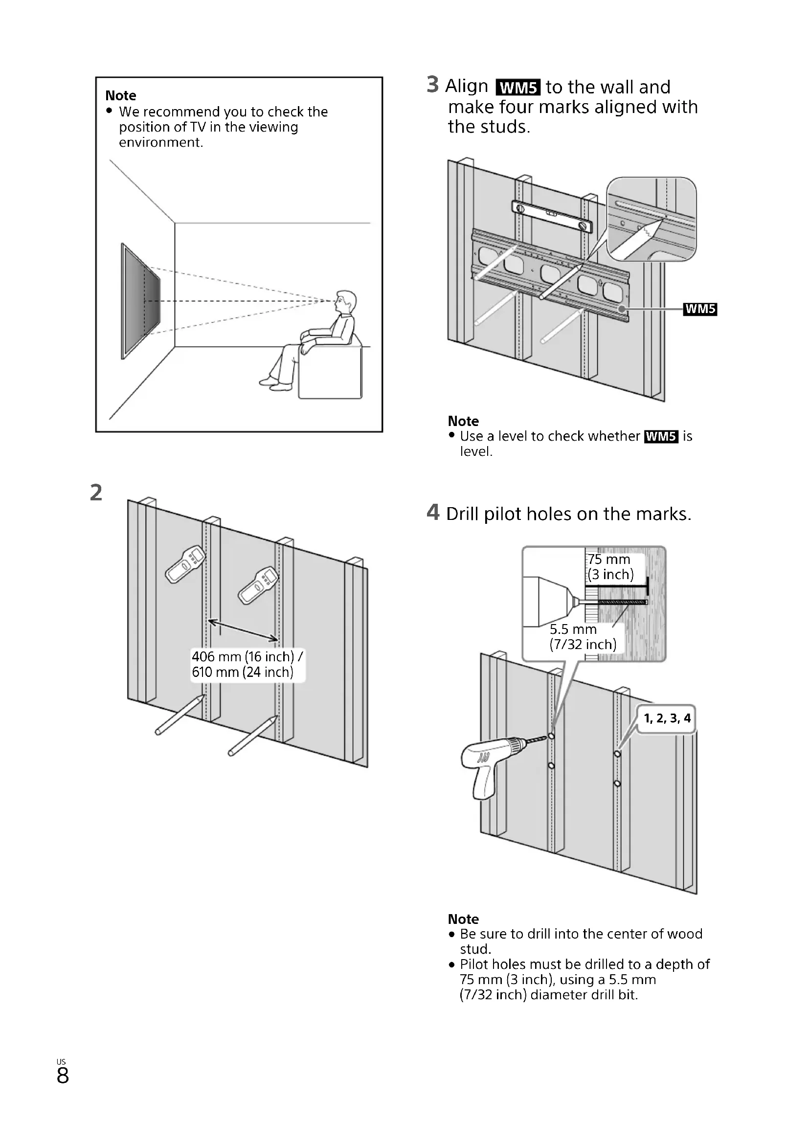 406 mm (16 inch) / 610 mm (24 inch) 3 Align WM5 to the wall and make four marks aligned with the studs. WM5 Note