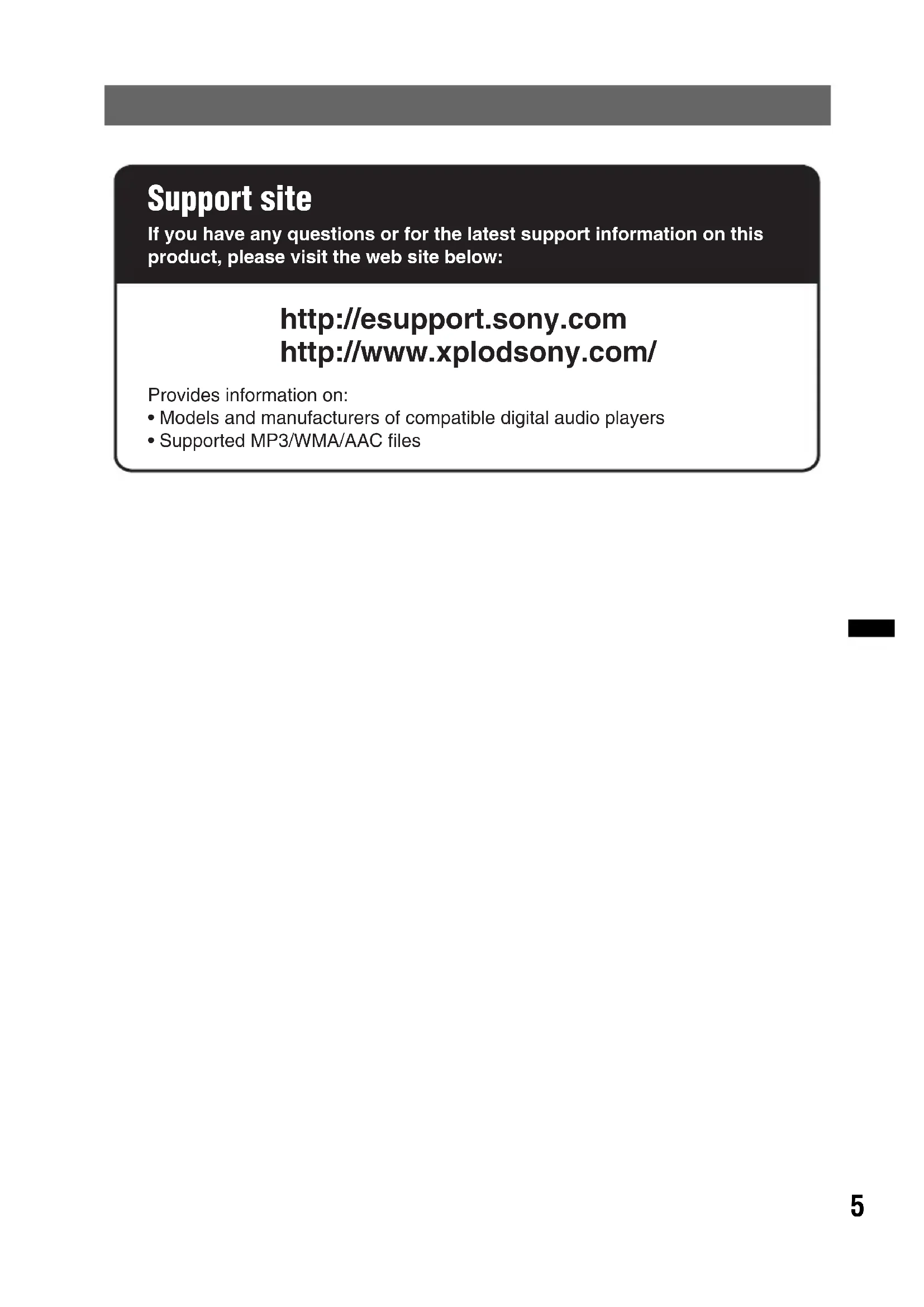 Track number/Elapsed playing time, Clock*1 The information of a CD TEXT, MP3/WMA/AAC is displayed.*2 Album number is displayed only when the album is changed. To change display items B, press (DSPL). Tip Displayed items may differ depending on model, disc type, recording format and settings. Repeat and shuffle play 1 During playback, press (3) (REP) or (4) (SHUF) repeatedly until the desired setting appears.* When an MP3/WMA/AAC is played.To return to normal play mode, select “ OFF” or “SHUF OFF.” USB devices For details on the compatibility of your USB device, visit the support site.• MSC (Mass Storage Class) and MTP (Media Transfer Protocol) type USB devices compliant with the USB standard can be used.• Corresponding codec is MP3 (.mp3), WMA (.wma) and AAC (.m4a).• Backup of data in a USB device is recommended. Note Connect the USB device after starting the engine.Depending on the USB device, malfunction or damage may occur if it is connected before starting the engine. Playing back a USB device 1 Slide the USB cover. 2 Connect the USB device to the USB connector.When using a cable, use the one supplied with the USB device to connect.Playback starts.If a USB device is already connected, to start playback, press (SOURCE) repeatedly until “USB” appears.Press (OFF) to stop playback.Select To play TRACK track repeatedly. ALBUM* album repeatedly.SHUF ALBUM* album in random order.SHUF DISC disc in random order. Support site http://esupport.sony.com http://www.xplodsony.com/15 Removing the USB device 1 Stop the USB device playback. 2 Remove the USB device. If you remove your USB device during playback, data in the USB device may be damaged. Notes• Do not use USB devices so large or heavy that they may fall down due to vibration, or cause a loose connection.• Do not detach the front panel during playback of the USB device, otherwise USB data may be damaged.• This unit cannot recognize USB devices via a USB hub. Display items A Source B Track name, Artist name, Album number*, Album name, Track number/Elapsed playing time, Clock