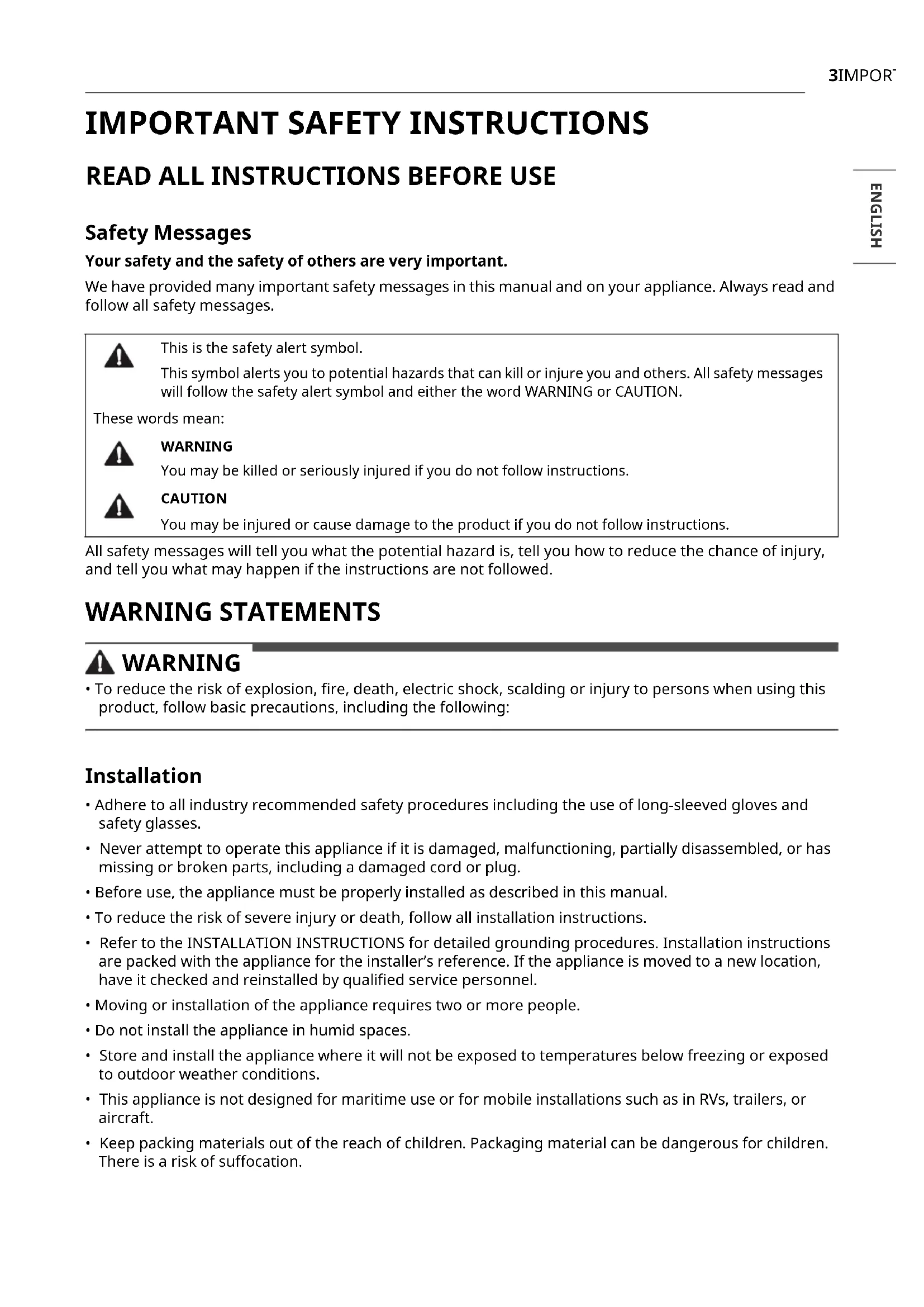 Safety Messages Your safety and the safety of others are very important. We have provided many important safety messages in this manual and on your appliance. Always read and follow all safety messages.All safety messages will tell you what the potential hazard is, tell you how to reduce the chance of injury, and tell you what may happen if the instructions are not followed. WARNING STATEMENTS WARNING