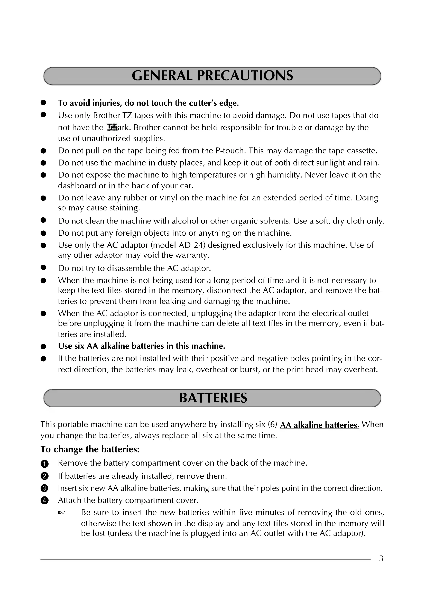 When the machine is not being used for a long period of time and it is not necessary to keep the text files stored in the memory, disconnect the AC adaptor, and remove the bat- teries to prevent them from leaking and damaging the machine.