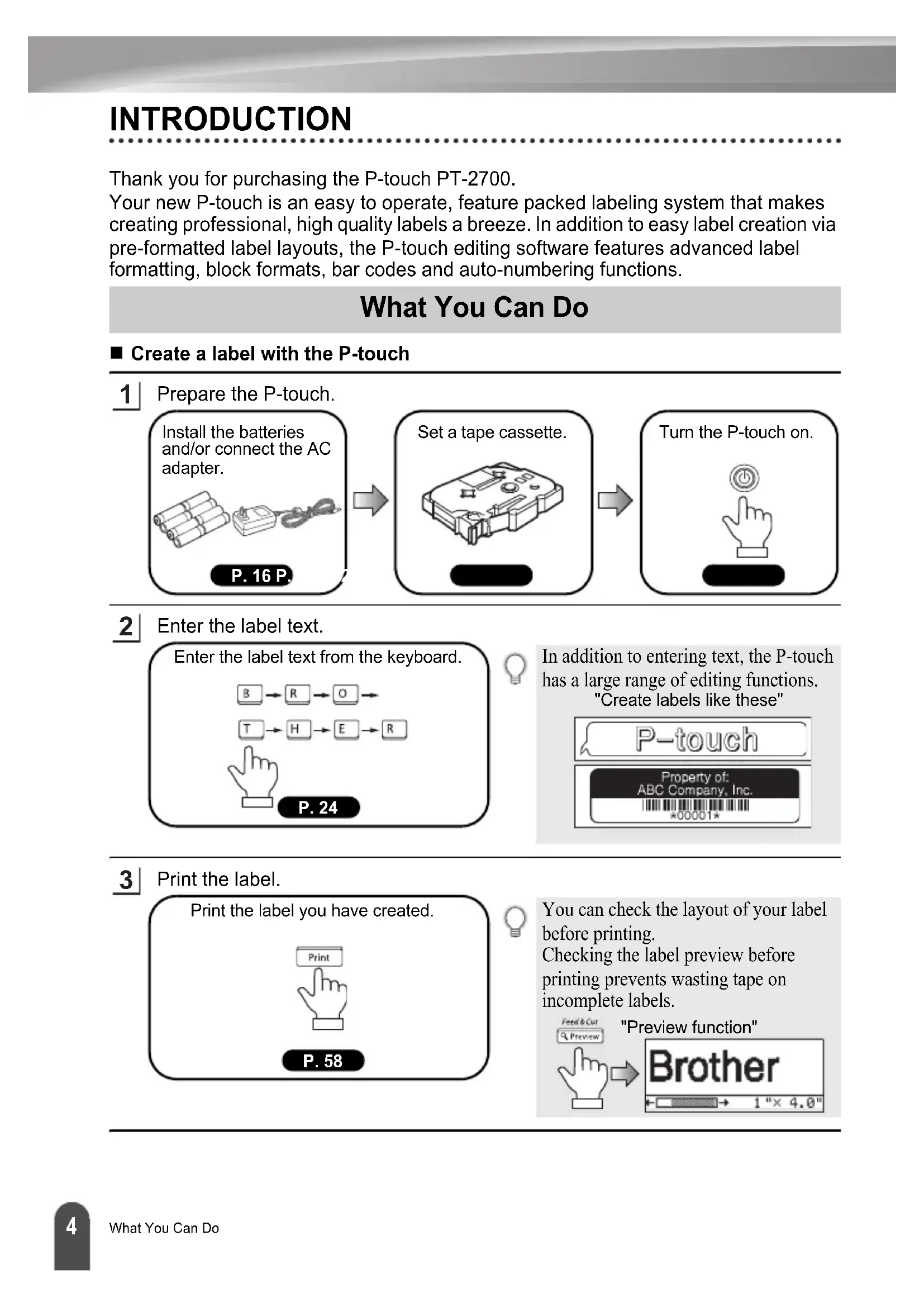 ABC auto-formatfunction ABC ABC ABC Quick Index Quick Index This section provides quick and easy access to information on tasks often needed by users. Simply look for your task below and then go to the page indicated. If the task you are looking for is not shown here, try the Contents or Index pages. ABC P. 24 P. 31 P. 62 P. 54 P. 59 P. 6611 Unpacking Your P-touch