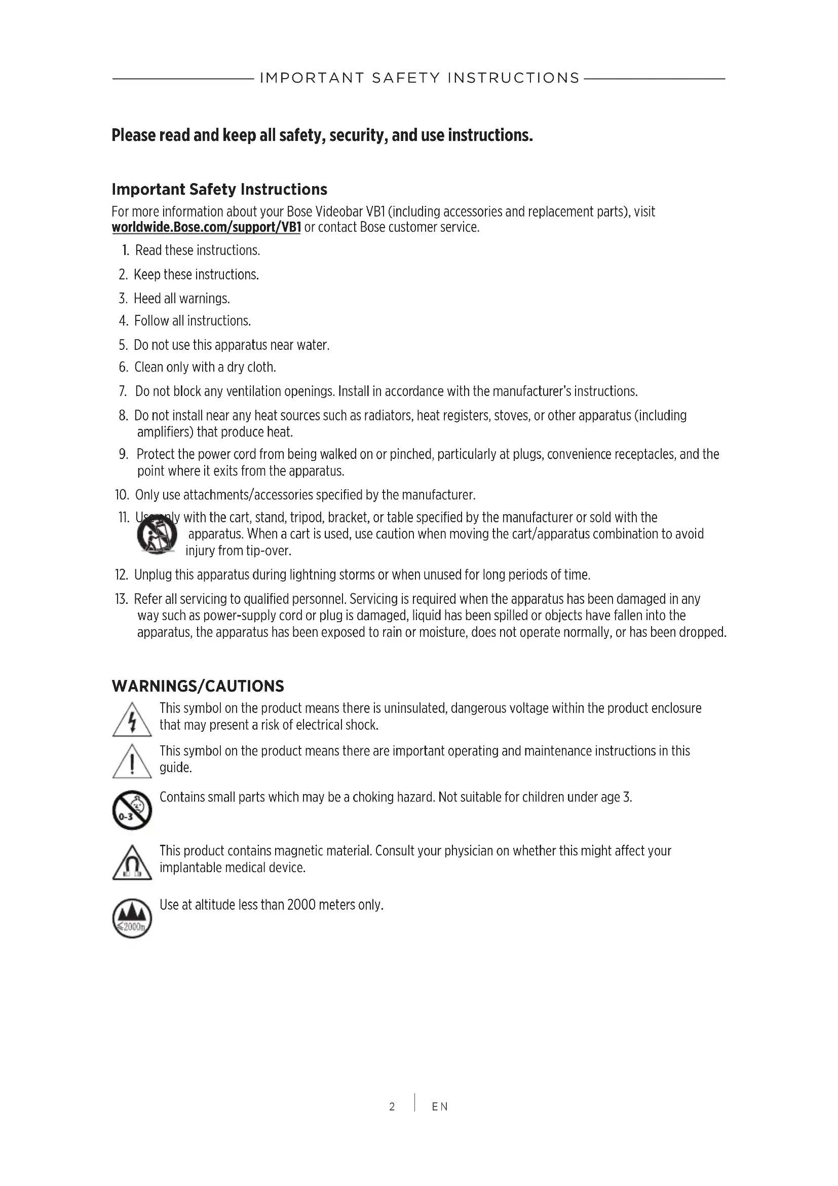 Please read and keep all safety, security, and use instructions. Important Safety Instructions For more information about your Bose Videobar VB1 (including accessories and replacement parts), visit worldwide.Bose.com/support/VB1 or contact Bose customer service.