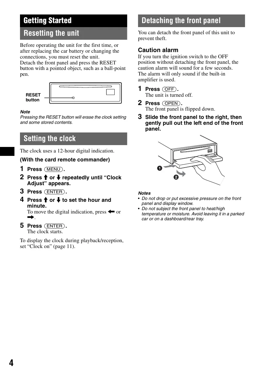 Getting Started Resetting the unit Before operating the unit for the first time, or after replacing the car battery or changing the connections, you must reset the unit. Detach the front panel and press the RESET button with a pointed object, such as a ball-point pen. RESET button Note Pressing the RESET button will erase the clock setting and some stored contents. Detaching the front panel You can detach the front panel of this unit to prevent theft. Caution alarm If you turn the ignition switch to the OFF position without detaching the front panel, the caution alarm will sound for a few seconds. The alarm will only sound if the built-in amplifier is used.