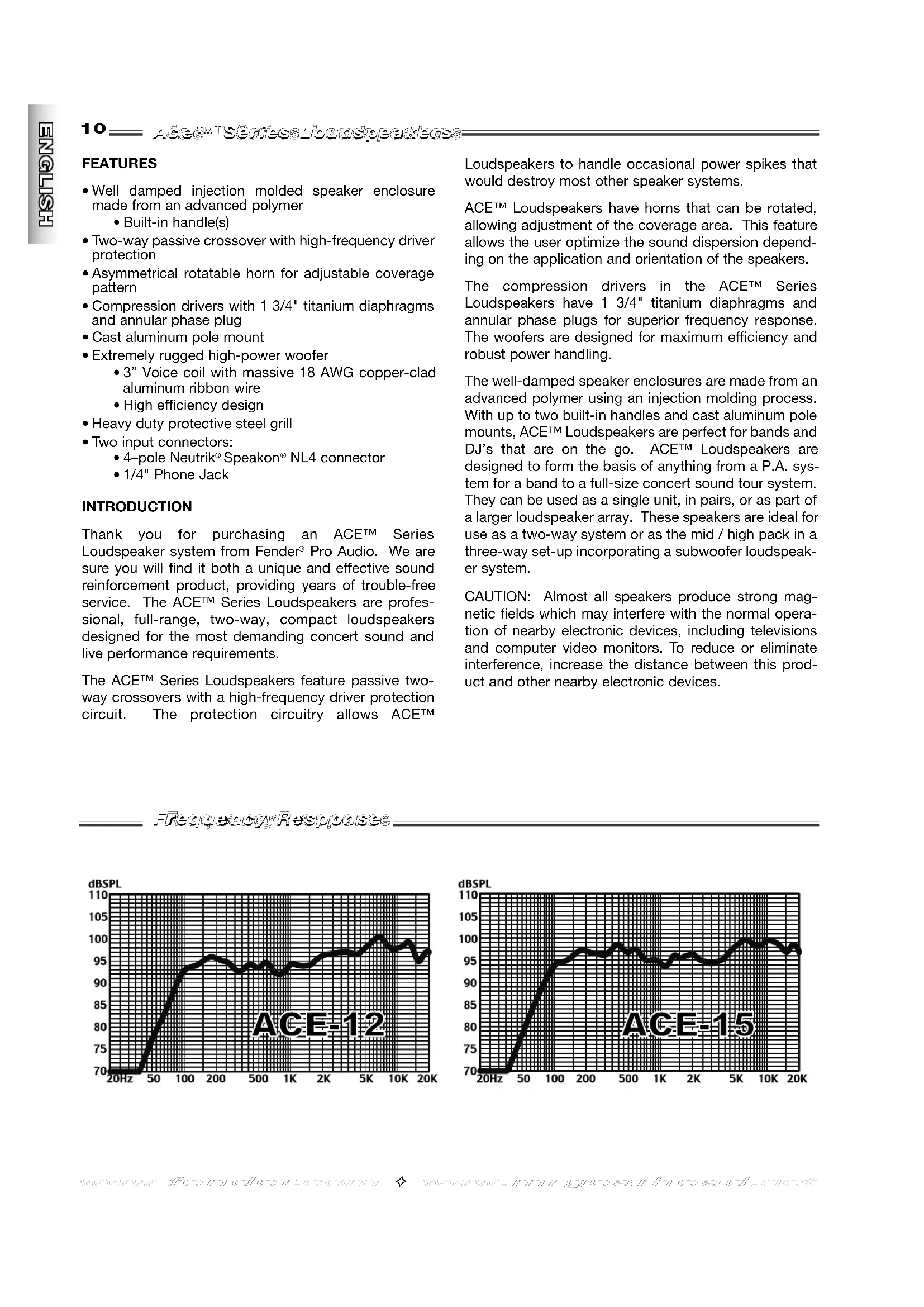 Pro Audio. We are sure you will find it both a unique and effective sound reinforcement product, providing years of trouble-free service. The ACE™ Series Loudspeakers are profes- sional, full-range, two-way, compact loudspeakers designed for the most demanding concert sound and live performance requirements. The ACE™ Series Loudspeakers feature passive two- way crossovers with a high-frequency driver protection circuit. The protection circuitry allows ACE™ Loudspeakers to handle occasional power spikes that would destroy most other speaker systems. ACE™ Loudspeakers have horns that can be rotated, allowing adjustment of the coverage area. This feature allows the user optimize the sound dispersion depend- ing on the application and orientation of the speakers. The compression drivers in the ACE™ Series Loudspeakers have 1 3/4" titanium diaphragms and annular phase plugs for superior frequency response. The woofers are designed for maximum efficiency and robust power handling. The well-damped speaker enclosures are made from an advanced polymer using an injection molding process. With up to two built-in handles and cast aluminum pole mounts, ACE™ Loudspeakers are perfect for bands and DJ’s that are on the go. ACE™ Loudspeakers are designed to form the basis of anything from a P.A. sys- tem for a band to a full-size concert sound tour system. They can be used as a single unit, in pairs, or as part of a larger loudspeaker array. These speakers are ideal for use as a two-way system or as the mid / high pack in a three-way set-up incorporating a subwoofer loudspeak- er system. CAUTION: Almost all speakers produce strong mag- netic fields which may interfere with the normal opera- tion of nearby electronic devices, including televisions and computer video monitors. To reduce or eliminate interference, increase the distance between this prod- uct and other nearby electronic devices.