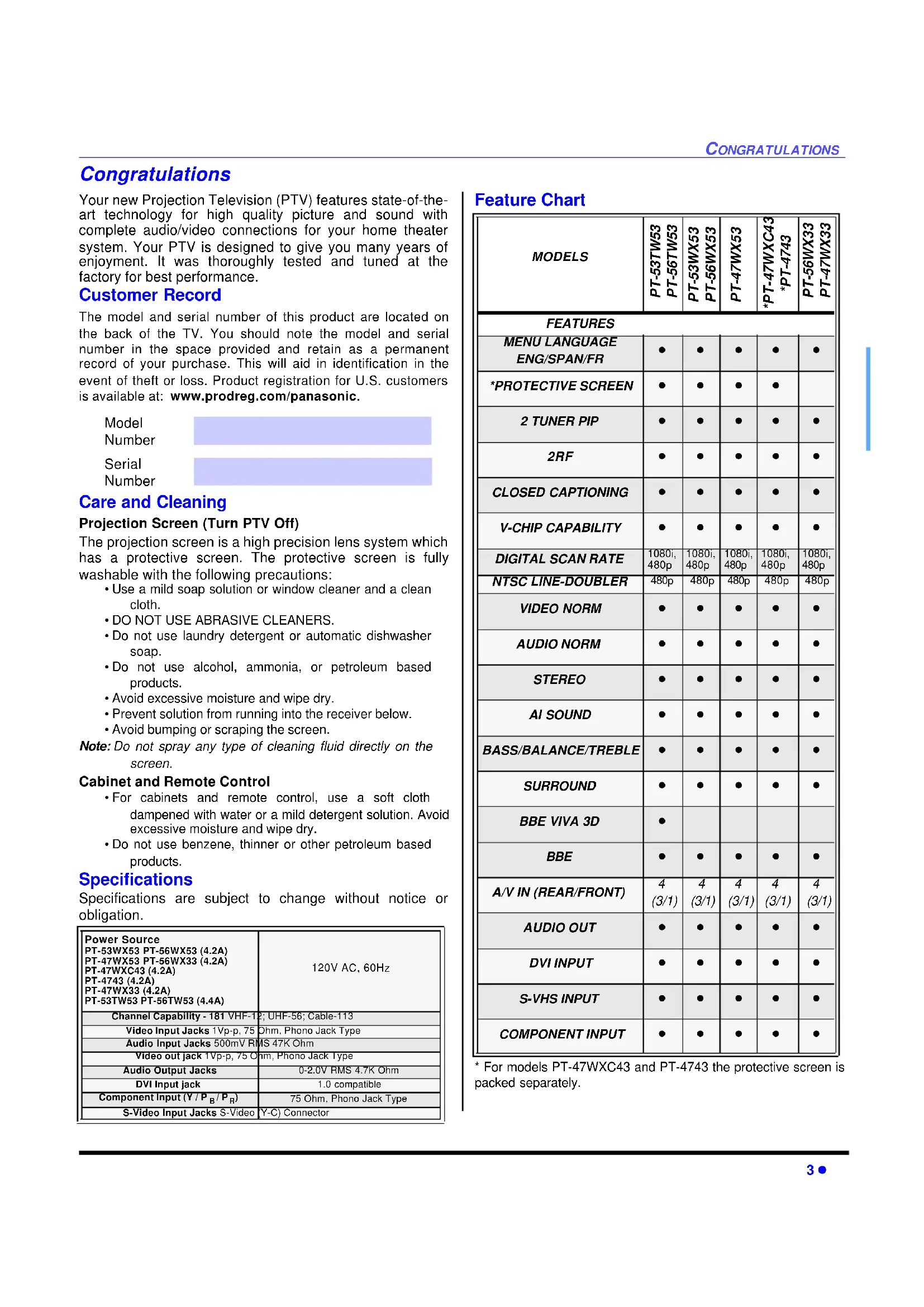 - Do not use benzene, thinner or other petroleum based products. Specifications Specifications are subject to change without notice or obligation. Feature Chart