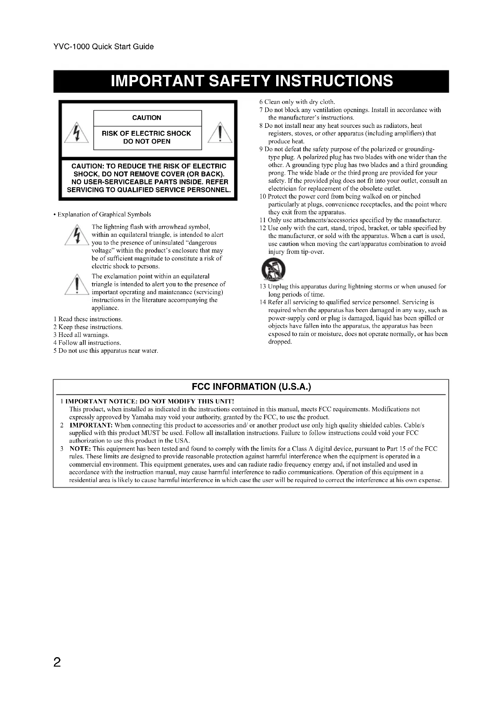 CAUTION: TO REDUCE THE RISK OF ELECTRIC SHOCK, DO NOT REMOVE COVER (OR BACK). NO USER-SERVICEABLE PARTS INSIDE. REFER SERVICING TO QUALIFIED SERVICE PERSONNEL.The lightning flash with arrowhead symbol, within an equilateral triangle, is intended to alert you to the presence of uninsulated “dangerous voltage” within the product’s enclosure that may be of sufficient magnitude to constitute a risk of electric shock to persons.The exclamation point within an equilateral triangle is intended to alert you to the presence of important operating and maintenance (servicing) instructions in the literature accompanying the appliance. CAUTIONRISK OF ELECTRIC SHOCK DO NOT OPEN FCC INFORMATION (U.S.A.) 1 IMPORTANT NOTICE: DO NOT MODIFY THIS UNIT! This product, when installed as indicated in the instructions contained in this manual, meets FCC requirements. Modifications not expressly approved by Yamaha may void your authority, granted by the FCC, to use the product. 2 IMPORTANT: When connecting this product to accessories and/ or another product use only high quality shielded cables. Cable/s supplied with this product MUST be used. Follow all installation instructions. Failure to follow instructions could void your FCC authorization to use this product in the USA. 3 NOTE: This equipment has been tested and found to comply with the limits for a Class A digital device, pursuant to Part 15 of the FCC rules. These limits are designed to provide reasonable protection against harmful interference when the equipment is operated in a commercial environment. This equipment generates, uses and can radiate radio frequency energy and, if not installed and used in accordance with the instruction manual, may cause harmful interference to radio communications. Operation of this equipment in a residential area is likely to cause harmful interference in which case the user will be required to correct the interference at his own expense.YVC-1000 Quick Start Guide