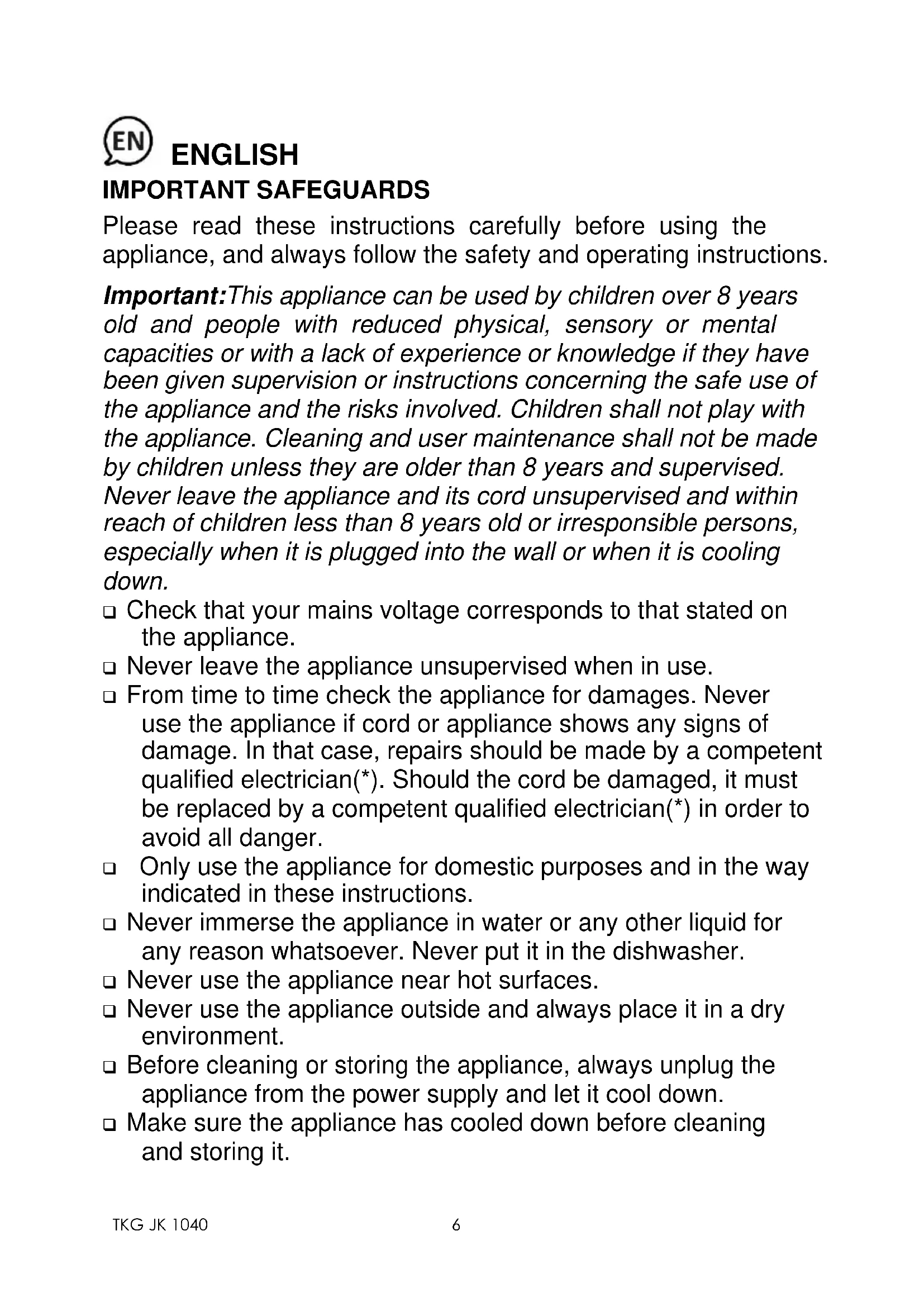 ENGLISH IMPORTANT SAFEGUARDS Please read these instructions carefully before using the appliance, and always follow the safety and operating instructions. Important:This appliance can be used by children over 8 years old and people with reduced physical, sensory or mental capacities or with a lack of experience or knowledge if they have been given supervision or instructions concerning the safe use of the appliance and the risks involved. Children shall not play with the appliance. Cleaning and user maintenance shall not be made by children unless they are older than 8 years and supervised. Never leave the appliance and its cord unsupervised and within reach of children less than 8 years old or irresponsible persons, especially when it is plugged into the wall or when it is cooling down. ❑ Check that your mains voltage corresponds to that stated on the appliance. ❑ Never leave the appliance unsupervised when in use. ❑ From time to time check the appliance for damages. Never use the appliance if cord or appliance shows any signs of damage. In that case, repairs should be made by a competent qualified electrician(*). Should the cord be damaged, it must be replaced by a competent qualified electrician(*) in order to avoid all danger. ❑ Only use the appliance for domestic purposes and in the way indicated in these instructions. ❑ Never immerse the appliance in water or any other liquid for any reason whatsoever. Never put it in the dishwasher. ❑ Never use the appliance near hot surfaces. ❑ Never use the appliance outside and always place it in a dry environment. ❑ Before cleaning or storing the appliance, always unplug the appliance from the power supply and let it cool down. ❑ Make sure the appliance has cooled down before cleaning and storing it.7 TKG JK 1040