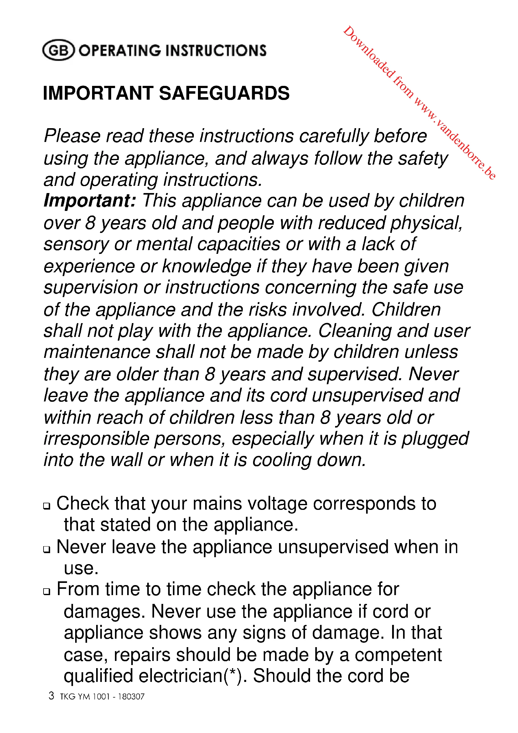 IMPORTANT SAFEGUARDS Please read these instructions carefully before using the appliance, and always follow the safety and operating instructions. Important: This appliance can be used by children over 8 years old and people with reduced physical, sensory or mental capacities or with a lack of experience or knowledge if they have been given supervision or instructions concerning the safe use of the appliance and the risks involved. Children shall not play with the appliance. Cleaning and user maintenance shall not be made by children unless they are older than 8 years and supervised. Never leave the appliance and its cord unsupervised and within reach of children less than 8 years old or irresponsible persons, especially when it is plugged into the wall or when it is cooling down. Check that your mains voltage corresponds to that stated on the appliance. Never leave the appliance unsupervised when in use. From time to time check the appliance for damages. Never use the appliance if cord or appliance shows any signs of damage. In that case, repairs should be made by a competent qualified electrician(*). Should the cord be Downloaded from www.vandenborre.beCopies of the I/B. Please reproduce them without any changes except under special instruction from Team International BELGIUM. The pages must be reproduced and folded in order to obtain a booklet A5 (+/- 148.5 mm width x 210 mm height). When folding, make sure you keep the good numbering when you turn the pages of the I/B. Don’t change the page numbering. Keep the language integrity.