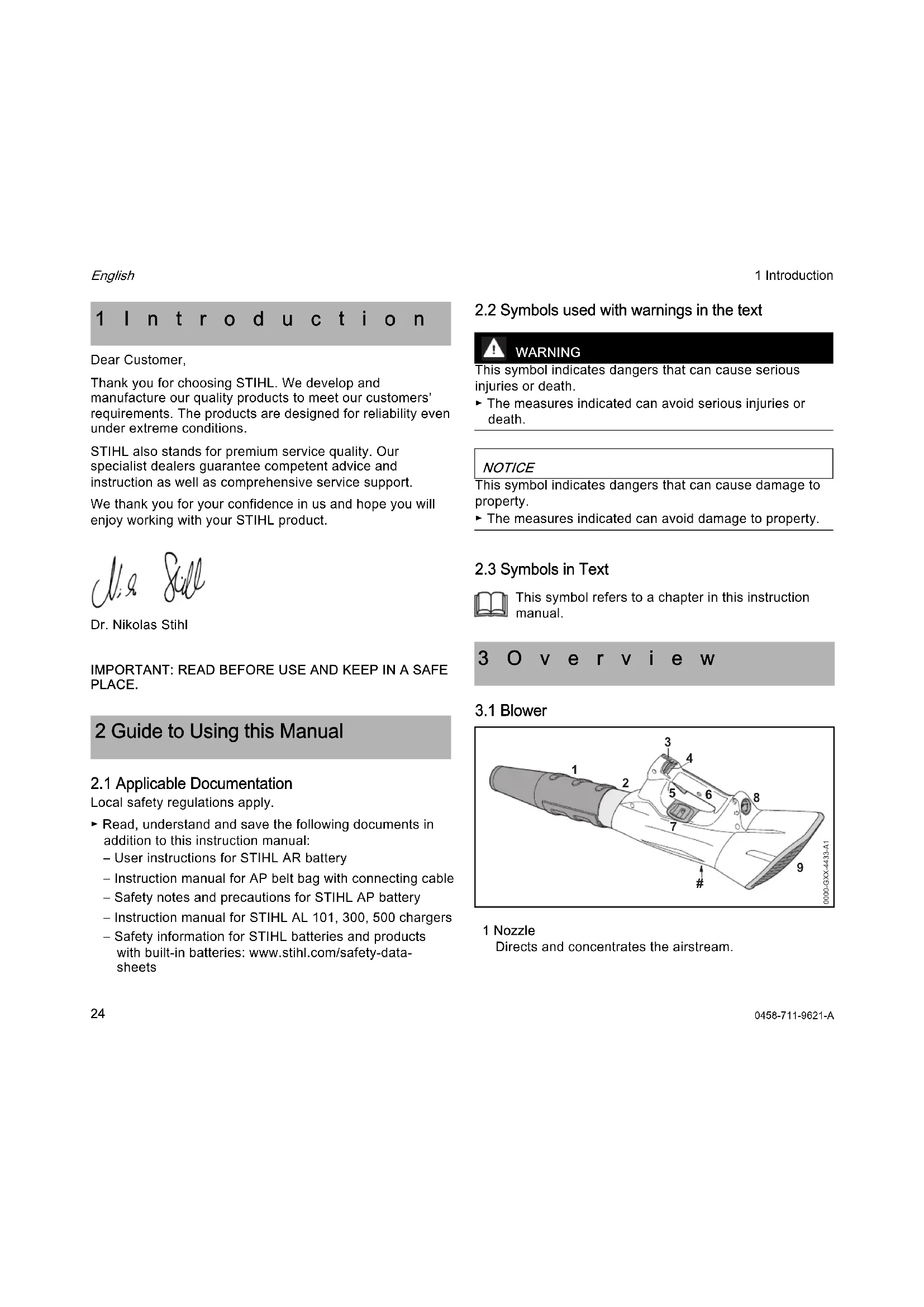 English 1 Introduction Dear Customer, Thank you for choosing STIHL. We develop and manufacture our quality products to meet our customers’ requirements. The products are designed for reliability even under extreme conditions. STIHL also stands for premium service quality. Our specialist dealers guarantee competent advice and instruction as well as comprehensive service support. We thank you for your confidence in us and hope you will enjoy working with your STIHL product. Dr. Nikolas Stihl IMPORTANT: READ BEFORE USE AND KEEP IN A SAFE PLACE.