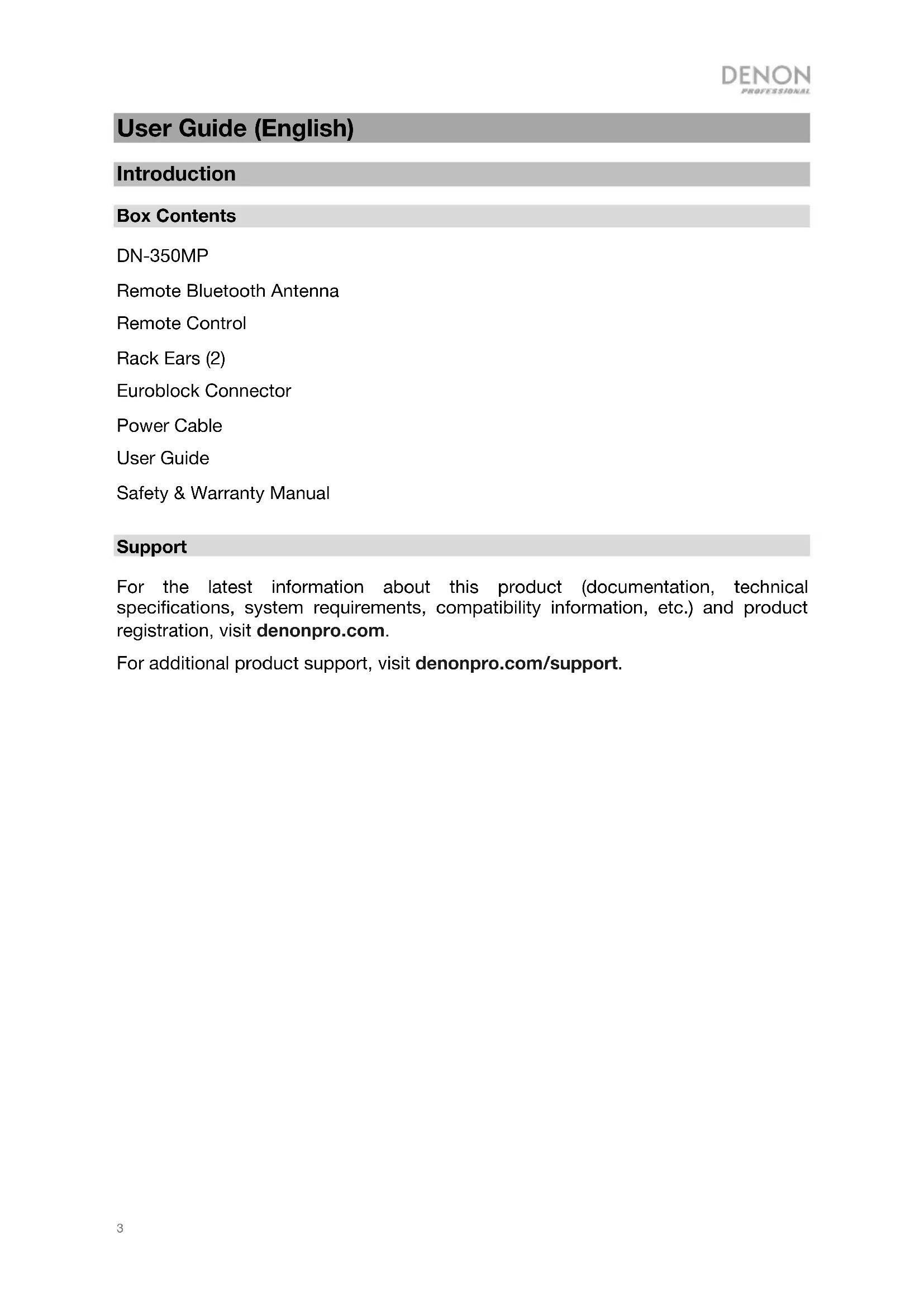 User Guide (English) Introduction Box Contents DN-350MP Remote Bluetooth Antenna Remote Control Rack Ears (2) Euroblock Connector Power Cable User Guide Safety & Warranty Manual Support For the latest information about this product (documentation, technical specifications, system requirements, compatibility information, etc.) and product registration, visit denonpro.com. For additional product support, visit denonpro.com/support.4