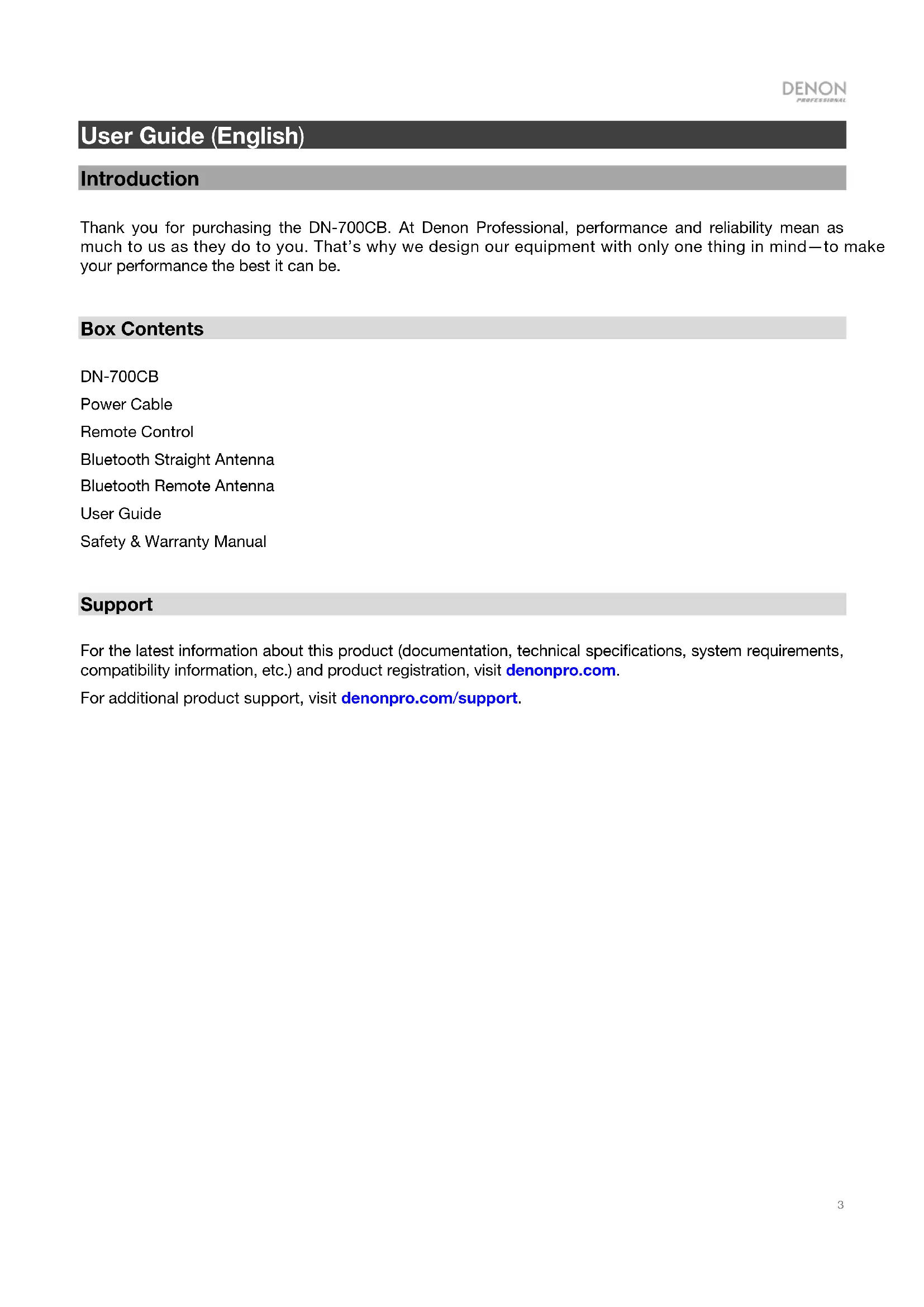 User Guide (English) Introduction Thank you for purchasing the DN-700CB. At Denon Professional, performance and reliability mean as much to us as they do to you. That’s why we design our equipment with only one thing in mind—to make your performance the best it can be.