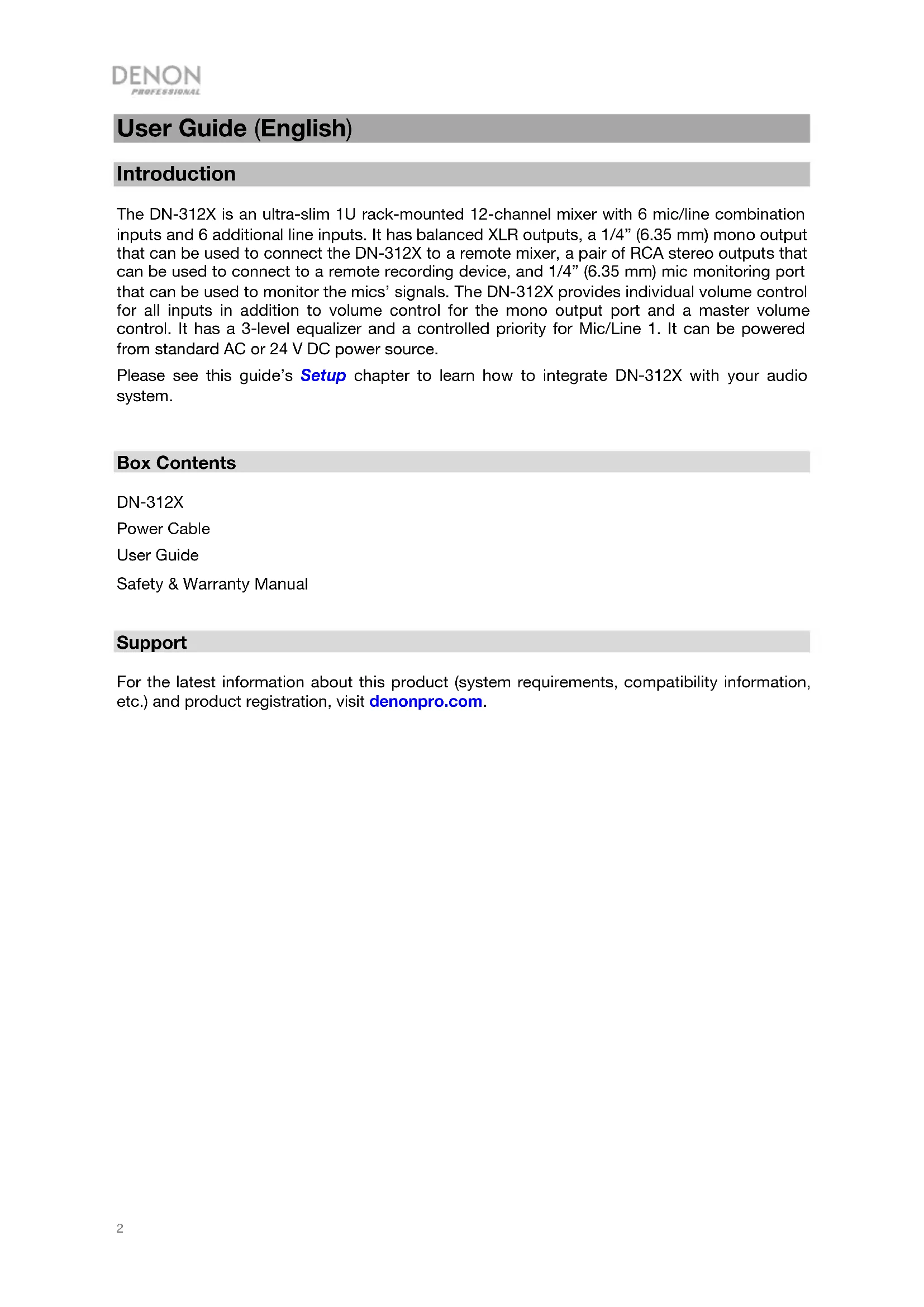 User Guide (English) Introduction The DN-312X is an ultra-slim 1U rack-mounted 12-channel mixer with 6 mic/line combination inputs and 6 additional line inputs. It has balanced XLR outputs, a 1/4” (6.35 mm) mono output that can be used to connect the DN-312X to a remote mixer, a pair of RCA stereo outputs that can be used to connect to a remote recording device, and 1/4” (6.35 mm) mic monitoring port that can be used to monitor the mics’ signals. The DN-312X provides individual volume control for all inputs in addition to volume control for the mono output port and a master volume control. It has a 3-level equalizer and a controlled priority for Mic/Line 1. It can be powered from standard AC or 24 V DC power source. Please see this guide’s Setup chapter to learn how to integrate DN-312X with your audio system.