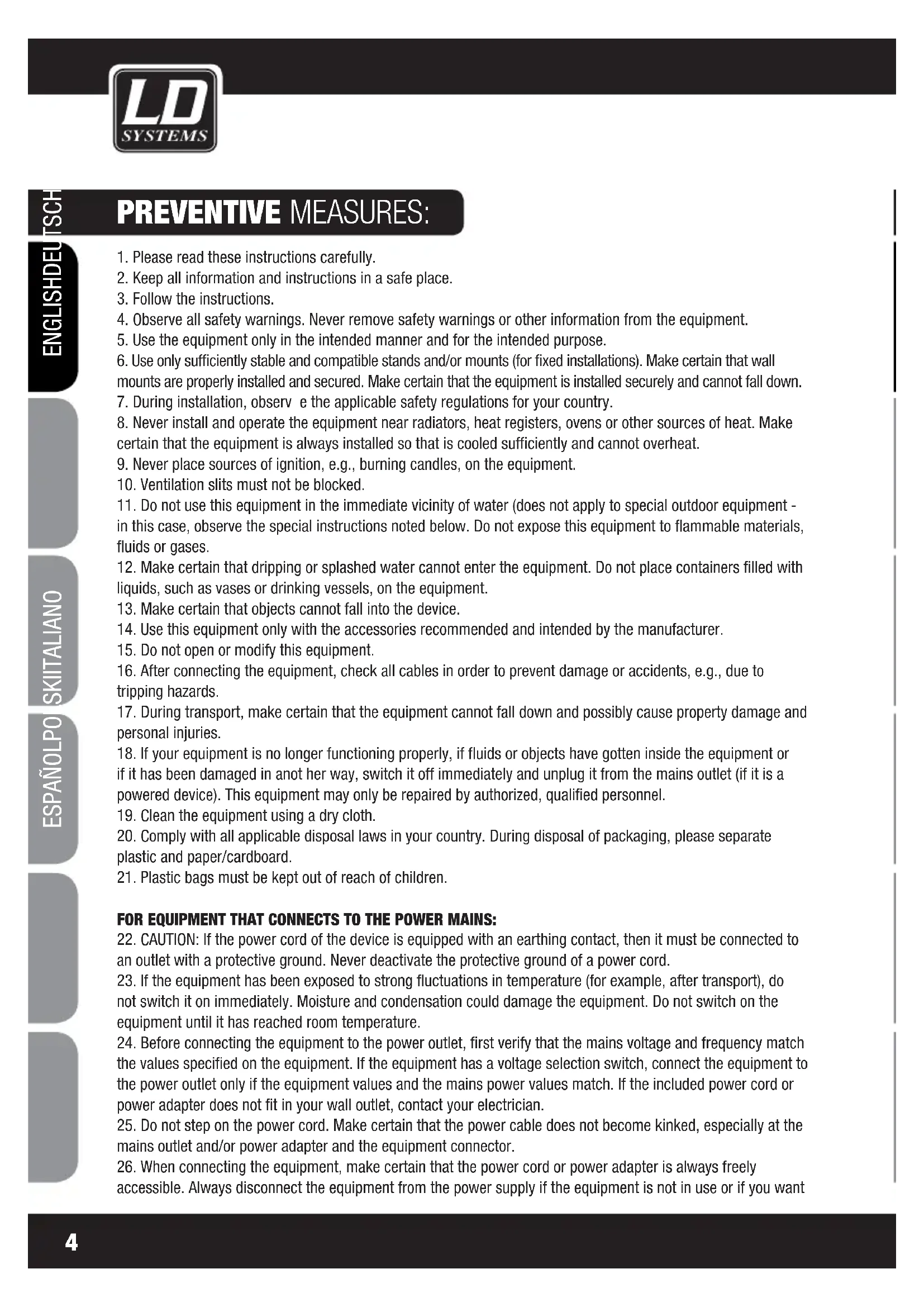 ENGLISHDEUTSCHFRANCAIS FRANCAISFRANCAIS FRANCAISFRANCAIS ESPAÑOLPOLSKIITALIANOSAFETY: to clean the equipment. Always unplug the power cord and power adapter from the power outlet at the plug or adapter and not by pulling on the cord. Never touch the power cord and power adapter with wet hands.