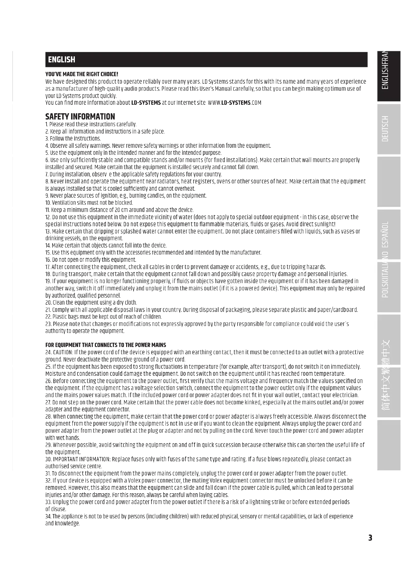 23. Please note that changes or modications not expressly approved by the party responsible for compliance could void the user´s authority to operate the equipment. FOR EQUIPMENT THAT CONNECTS TO THE POWER MAINS 24. CAUTION: If the power cord of the device is equipped with an earthing contact, then it must be connected to an outlet with a protective ground. Never deactivate the protective ground of a power cord. 25. If the equipment has been exposed to strong uctuations in temperature (for example, after transport), do not switch it on immediately. Moisture and condensation could damage the equipment. Do not switch on the equipment until it has reached room temperature. 26. Before connecting the equipment to the power outlet, rst verify that the mains voltage and frequency match the values specied on the equipment. If the equipment has a voltage selection switch, connect the equipment to the power outlet only if the equipment values and the mains power values match. If the included power cord or power adapter does not t in your wall outlet, contact your electrician. 27. Do not step on the power cord. Make certain that the power cable does not become kinked, especially at the mains outlet and/or power adapter and the equipment connector. 28. When connecting the equipment, make certain that the power cord or power adapter is always freely accessible. Always disconnect the equipment from the power supply if the equipment is not in use or if you want to clean the equipment. Always unplug the power cord and power adapter from the power outlet at the plug or adapter and not by pulling on the cord. Never touch the power cord and power adapter with wet hands. 29. Whenever possible, avoid switching the equipment on and off in quick succession because otherwise this can shorten the useful life of the equipment. 30. IMPORTANT INFORMATION: Replace fuses only with fuses of the same type and rating. If a fuse blows repeatedly, please contact an authorised service centre. 31. To disconnect the equipment from the power mains completely, unplug the power cord or power adapter from the power outlet. 32. If your device is equipped with a Volex power connector, the mating Volex equipment connector must be unlocked before it can be removed. However, this also means that the equipment can slide and fall down if the power cable is pulled, which can lead to personal injuries and/or other damage. For this reason, always be careful when laying cables. 33. Unplug the power cord and power adapter from the power outlet if there is a risk of a lightning strike or before extended periods of disuse. 34. The appliance is not to be used by persons (including children) with reduced physical, sensory or mental capabilities, or lack of experience and knowledge.4 DEUTSCHENGLISH FRANCAIS ESPAÑOL POLSKI ITALIANO