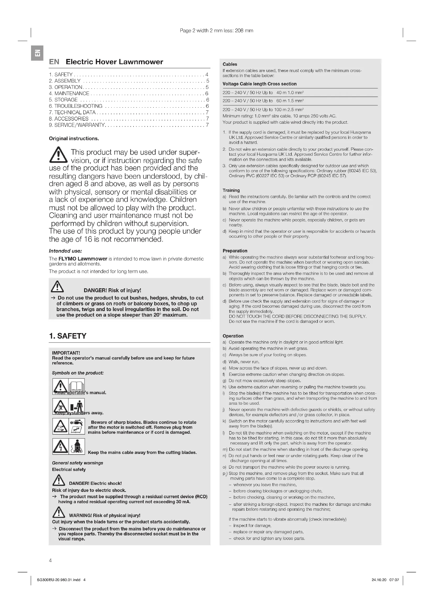 SG300EU-20.960.01.indd 4 24.10.20 07:07Maintenance and storage a) Keep all nuts, bolts, and screws tight to be sure the machine is in safe working condition. b) Check the grass collector frequently for wear or deterioration. c) Replace worn or damaged parts for safety. d) On machines with multi blade, take care as rotating one blade can cause other blades rotate. e) Be careful during adjustment of the machine to prevent entrapment of the fingers between moving blades and fixed parts of the machine. f) Always allow the machine to cool down before storing. g) When servicing the blades be aware that, even though the power source is switched off, the blades can still be moved. h) Use only genuine replacement parts and accessories. Additional safety warnings Electrical safety DANGER! Cardiac arrest! This product makes an electromagnetic field while it operates. This field may under some conditions interfere with active or passive medical implants. To decrease the risk of conditions that can possibly injure or kill, we recommend persons with medical implants to speak with their physician and the medical implant manufacturer before you operate the product. Before use, examine the cable for signs of damage or ageing. If the cable is found to be defective, take the product to an authorised Service Centre and have the cable replaced. Do not use the product if the electric cables are damaged or worn. Immediately disconnect from the mains if the cable is cut, or the insulation is damaged. Do not touch the electric cable until the cable has been disconnected. Do not repair a cut or damaged cable. Replace it with a new one. The extension cable must be uncoiled. Coiled cables can overheat and reduce the efficiency of your mower. Keep the extension cable away from product, always work away from the power point mowing up and down, never in circles. Do not pull cable around sharp objects. Always switch off at the mains before disconnecting any plug, cable connector or extension cable. Stop the motor, disconnect the mains and examine the cable for damage or ageing before you wind the cable for storage. Do not repair a damaged cable, replace it with a new one. Use only genuine replacement cable. Always wind the cable carefully, avoid kinking. Do not carry the product by the cable. Do not pull on the cable to disconnect any of the plugs. Use only on AC mains supply voltage shown on the product rating label. Our products are double insulated to EN60335. Do not connect an earth to any part of the product. Check the working area for hidden cables. Do not use for pond care or close to water. Personal safety DANGER! Risk of suffocation! Small parts can be easily swallowed. There is also a risk that the poly- bagcan suffocate toddlers. Keep toddlers away when you assemble the product. Let the hover mower to cool down for at least 30 minutes before storage or maintenance. If blockage of cutting element stop product and check. Do not tilt the machine into the direction of the user. Do not move backwards. Stay alert during operation. Do not use in explosive atmosphere. Do not operate the product when you are tired, ill or under the influence of alcohol, drugs or medicine or when you are exhausted. Do not overload the mower. Use gloves, wear slip resistant shoes and wear eye protection. Do not use under wet conditions. Do not use on wet grass. Do not disassemble the product further than the delivery status. Only start the mower with an upright standing handle. Do not use the start levers alternately. Use the handles carefully. Safety Cut-Out The motor is protected by a Safety Cut-Out which is activated when the blade becomes jammed or if the motor is overloaded. When this occurs, stop and dis- connect the product from the mains. The Safety Cut-Out will only reset when you release the start / stop lever. Clear any obstruction and wait for a few minutes for the Safety Cut-Out to reset before you continue to use the product.