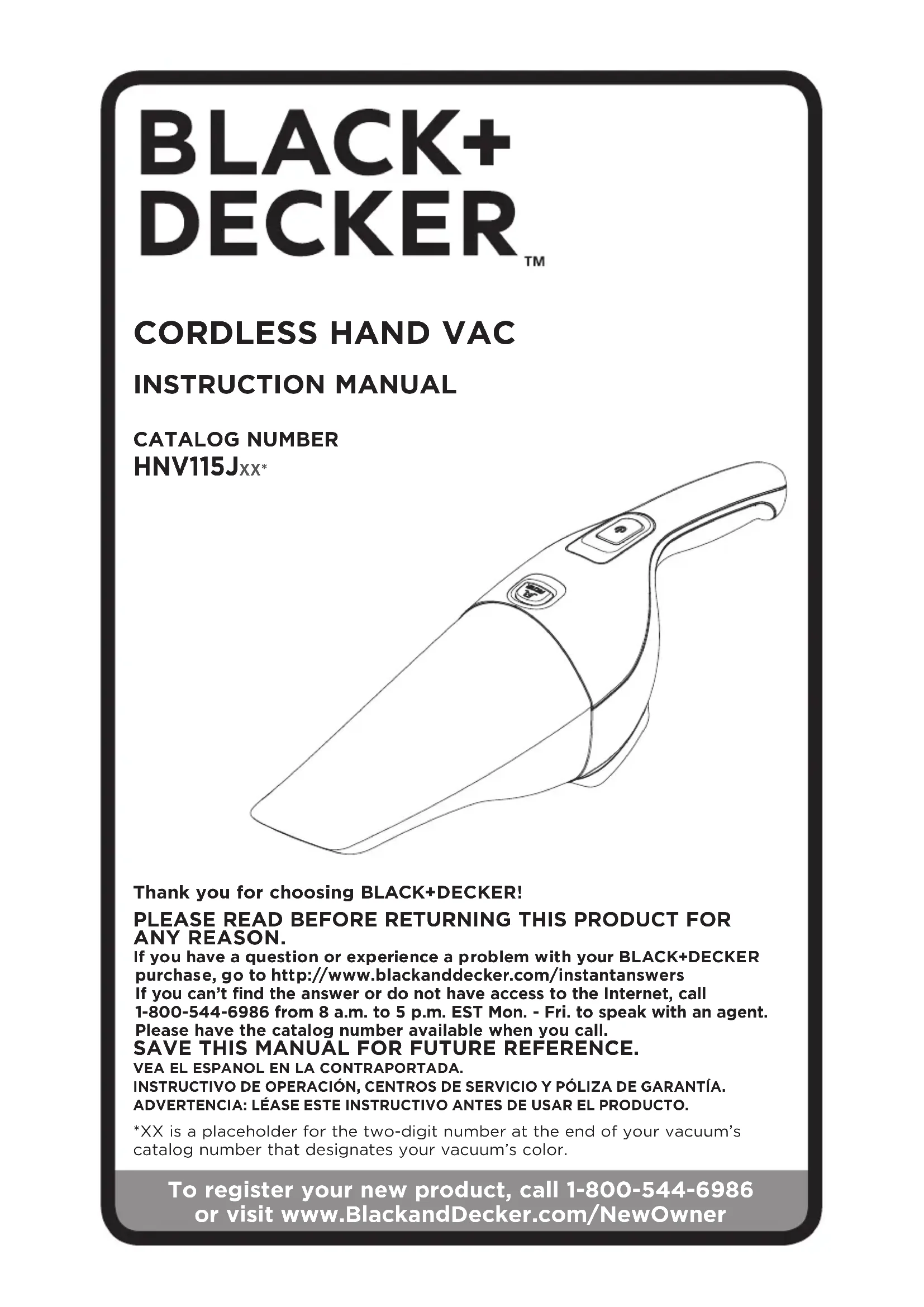 Thank you for choosing BLACK+DECKER! PLEASE READ BEFORE RETURNING THIS PRODUCT FOR ANY REASON. If you have a question or experience a problem with your BLACK+DECKER purchase, go to http://www.blackanddecker.com/instantanswers If you can’t find the answer or do not have access to the Internet, call 1-800-544-6986 from 8 a.m. to 5 p.m. EST Mon. - Fri. to speak with an agent. Please have the catalog number available when you call. SAVE THIS MANUAL FOR FUTURE REFERENCE. VEA EL ESPANOL EN LA CONTRAPORTADA.INSTRUCTIVO DE OPERACIÓN, CENTROS DE SERVICIO Y PÓLIZA DE GARANTÍA. ADVERTENCIA: LÉASE ESTE INSTRUCTIVO ANTES DE USAR EL PRODUCTO.*XX is a placeholder for the two-digit number at the end of your vacuum’s catalog number that designates your vacuum’s color. CATALOG NUMBER HNV115JXX* To register your new product, call 1-800-544-6986 or visit www.BlackandDecker.com/NewOwner2