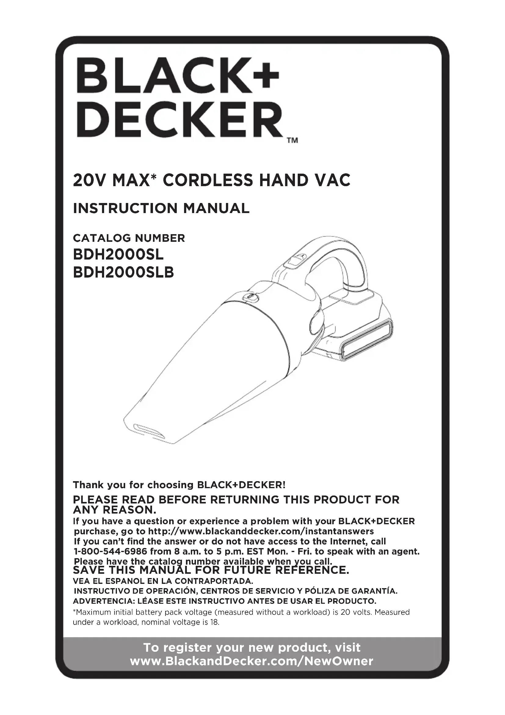 Thank you for choosing BLACK+DECKER! PLEASE READ BEFORE RETURNING THIS PRODUCT FOR ANY REASON. If you have a question or experience a problem with your BLACK+DECKER purchase, go to http://www.blackanddecker.com/instantanswers If you can’t find the answer or do not have access to the Internet, call 1-800-544-6986 from 8 a.m. to 5 p.m. EST Mon. - Fri. to speak with an agent. Please have the catalog number available when you call. SAVE THIS MANUAL FOR FUTURE REFERENCE. VEA EL ESPANOL EN LA CONTRAPORTADA.INSTRUCTIVO DE OPERACIÓN, CENTROS DE SERVICIO Y PÓLIZA DE GARANTÍA. ADVERTENCIA: LÉASE ESTE INSTRUCTIVO ANTES DE USAR EL PRODUCTO.*Maximum initial battery pack voltage (measured without a workload) is 20 volts. Measured under a workload, nominal voltage is 18. CATALOG NUMBER BDH2000SL BDH2000SLB To register your new product, visit www.BlackandDecker.com/NewOwner2