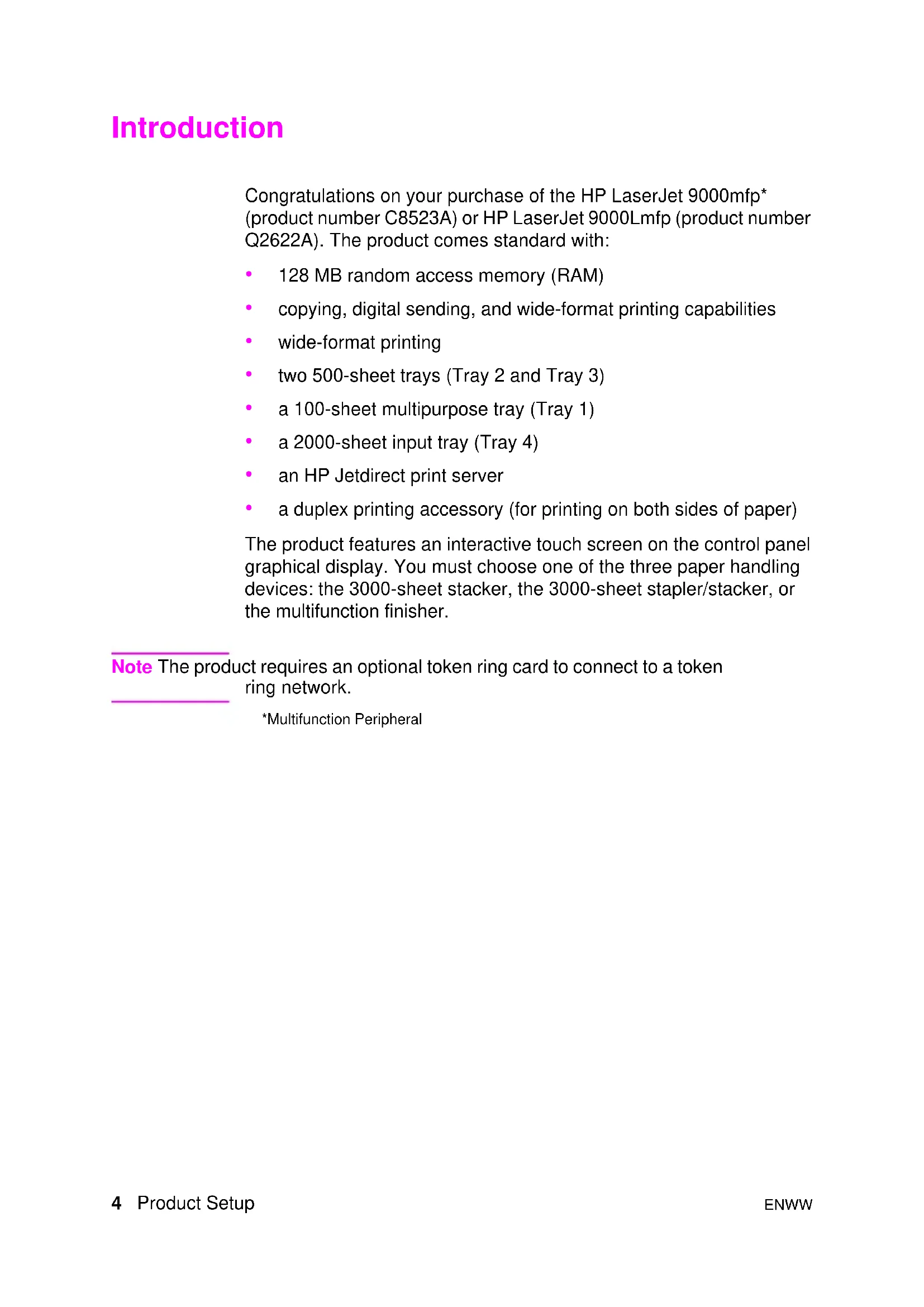 a duplex printing accessory (for printing on both sides of paper) The product features an interactive touch screen on the control panel graphical display. You must choose one of the three paper handling devices: the 3000-sheet stacker, the 3000-sheet stapler/stacker, or the multifunction finisher. Note The product requires an optional token ring card to connect to a token ring network. *Multifunction PeripheralENWW Where to look for information 5 English Where to look for information Start guide This guide contains information about unpacking and installing your product. Introduce guide This guide contains information about performing basic copying, sending, and printing tasks. Introduce is available on the CD-ROM that came with the product. If you would like a hard copy, use your product to print the introduce guide. Use guide This guide contains detailed information about using and troubleshooting and is available on the World Wide Web at http://www.hp.com/support/lj9000. If you would like a hard copy, use your product to print the use guide.6 Product Setup ENWW Installation checklist This guide will help you set up and install your new product. For proper installation, please complete each section in order. WARNING! To avoid injury, do not attempt to lift the product. The product has been designed to roll on wheels.