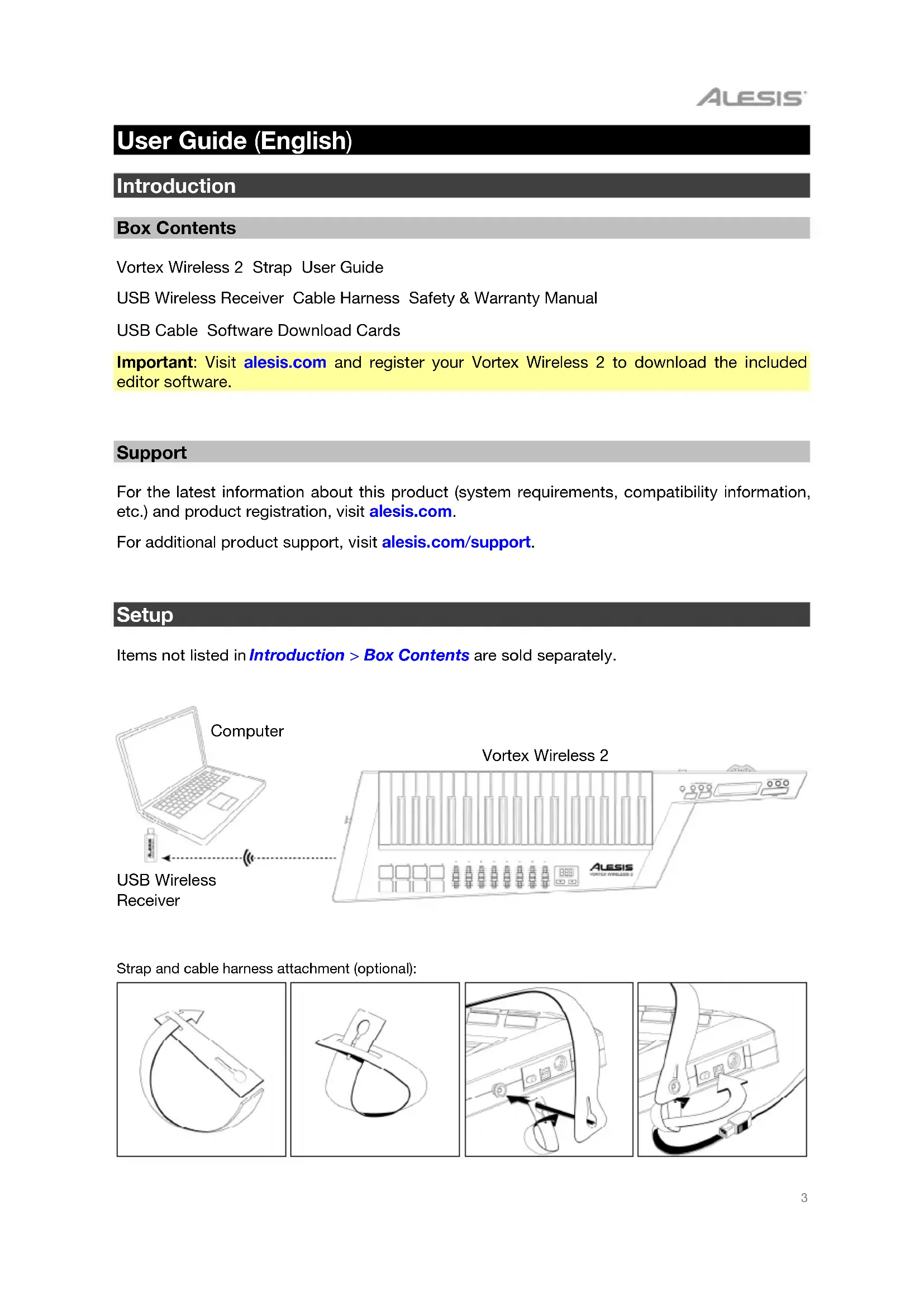 User Guide (English) Introduction Box Contents Vortex Wireless 2 Strap User Guide USB Wireless Receiver Cable Harness Safety & Warranty Manual USB Cable Software Download Cards Important: Visit alesis.com and register your Vortex Wireless 2 to download the included editor software.