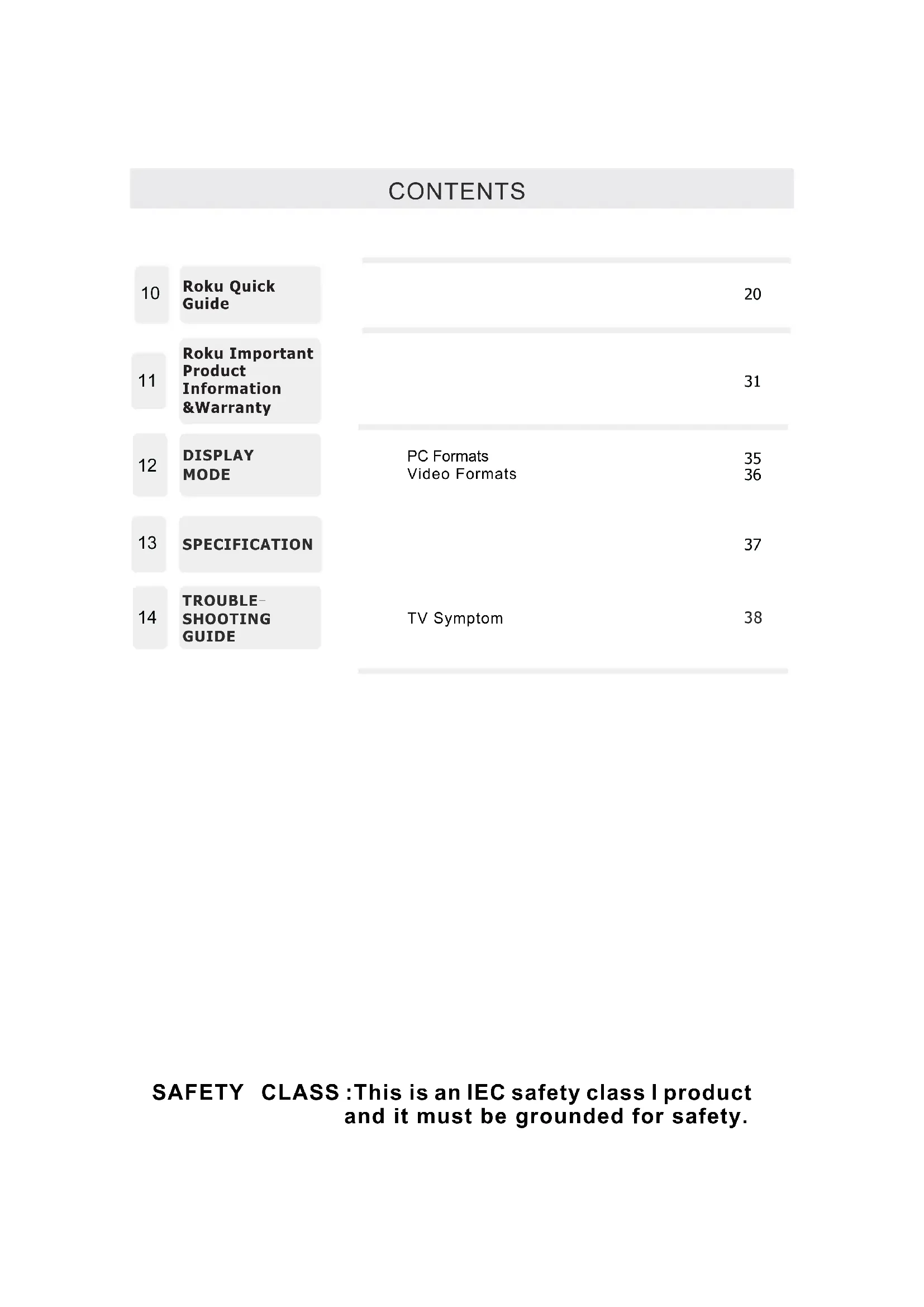 31Important:ƫ$!*ƫ!)%(%*#ƫ"+.ƫƫƫ*1)!.Čƫ,(!/!ƫ,.+2% !ƫ0$!ƫ"+((+3%*#ƫ%*"+.)0%+*ƫ with your request: (a) model number, (b) serial number, (c) problem description, (d) software version (located in the System Configuration menu), (e) date of purchase, (f) place of purchase (re-seller or online place of purchase), and (g) return shipping .!//ƫĨċċƫ+4!/ƫ.!ƫ*+0ƫ!,0! ĩċ Scope of and Limitation on Warranty The warranty on the Streaming Stick is limited to the repair or replacement of defective units as described in the Limited Warranty section above. This warranty does not cover customer training or education, installation, set up adjustments, or signal reception problems. This warranty also does not cover any issue related to the service provided by your Service Provider, including but not limited to service disruption, changes in service terms, changes in oerings, changes in format, or technical problems. $%/ƫ3..*05ƫ +!/ƫ *+0ƫ +2!.ƫ )#!ƫ 1!ƫ 0+ƫ0/ƫ +"ƫ + Čƫ % !*0Čƫ)%/1/!Čƫ 1/!Čƫ negligence, commercial use or modification of, or to any part of, your Streaming Stick. This warranty does not cover damage due to improper operation or maintenance, connection to improper voltage supply or attempted repair by anyone other than a facility authorized by Roku to service your Streaming Stick. This warranty does not cover consumables (such as fuses and batteries). Legal Notices Federal Communication Commission Interference Statement $%/ƫ !-1%,)!*0ƫ $/ƫ !!*ƫ 0!/0! ƫ * ƫ "+1* ƫ 0+ƫ +),(5ƫ 3%0$ƫ 0$!ƫ (%)%0/ƫ "+.ƫ ƫ (//ƫ ƫ digital device, pursuant to Part 15 of the FCC Rules. These limits are designed to provide reasonable protection against harmful interference in a residential installation. This equipment generates, uses and can radiate radio frequency energy and, if not installed and used in accordance with the instructions, may cause harmful interference to radio communications. However, there is no guarantee that interference will not occur in a particular installation. If this equipment does cause harmful interference to radio or television reception, which can be determined by turning the equipment o and on, the user is encouraged to try to correct the interference by one of the following measures: đƫ!+.%!*0ƫ+.ƫ.!(+0!ƫ0$!ƫ.!!%2%*#ƫ*0!**ċ đƫ*.!/!ƫ0$!ƫ/!,.0%+*ƫ!03!!*ƫ0$!ƫ!-1%,)!*0ƫ* ƫ.!!%2!.ċ đƫ+**!0ƫ0$!ƫ!-1%,)!*0ƫ%*0+ƫ*ƫ+10(!0ƫ+*ƫƫ%.1%0ƫ %û!.!*0ƫ".+)ƫ0$0ƫ0+ƫ3$%$ƫ0$!ƫ receiver is connected. đƫ+*/1(0ƫ0$!ƫ !(!.ƫ+.ƫ*ƫ!4,!.%!*! ƫ. %+ĥƫ0!$*%%*ƫ"+.ƫ$!(,ċ $%/ƫ !2%!ƫ +),(%!/ƫ 3%0$ƫ .0ƫ āĆƫ +"ƫ 0$!ƫ ƫ 1(!/ċƫ ,!.0%+*ƫ %/ƫ /1&!0ƫ 0+ƫ 0$!ƫ following two conditions: (1) This device may not cause harmful interference, and (2) this device must accept any interference received, including interference that may cause undesired operation. 32FCC Caution: responsible for compliance could void the user’s authority to operate this equipment. channels 1 through 11. Wireless Radio Use: band. IMPORTANT NOTE: FCC Radiation Exposure Statement: This equipment complies with FCC radiation exposure limits set forth for an uncontrolled environment. This equipment should be installed and operated with minimum distance 20cm between the radiator and your body. This transmitter must not be co-located or operating in conjunction with any other antenna or transmitter. Note to US model owner: To comply with US FCC regulation, the country selection function has been completely removed from all US models. The availability of some VSHFL´F channels and/or operational frequency bands are country dependent and are ´Umware programmed at the factory to match the intended destination. The ´Umware setting is not accessible by the end user. Safety Precautions The Streaming Stick has been designed with the highest concern for safety. However, any electrical device, if used improperly, has the potential for causing ´re, electrical shock or personal injury. To help ensure accident-free operation, follow these guidelines: electrical outlet and disconnect any other cables immediately if the Streaming Stick or the device functions in an abnormal manner, produces unusual sounds or smells or becomes too hot to touch. roku.com/support. 33trademarks or registered trademarks of Roku, Inc. Use and Handling of small children. Stick or accessories. humidity or direct sunlight. www.roku.com 34DISPLAY MODE PC FORMATS NOTE: This product does not support the display mode not listed above. In order to achieve the best display effect, please select the above-listed 6 display modes input signal. Because of the difference of display drivers output signal (especially non-standard signal output), the display image may appear little disturbance which can be adjusted on the PC menu. To prolong this unit's service life, please set your computer to power management mode. 35DISPLAY MODE VIDEO FORMATS