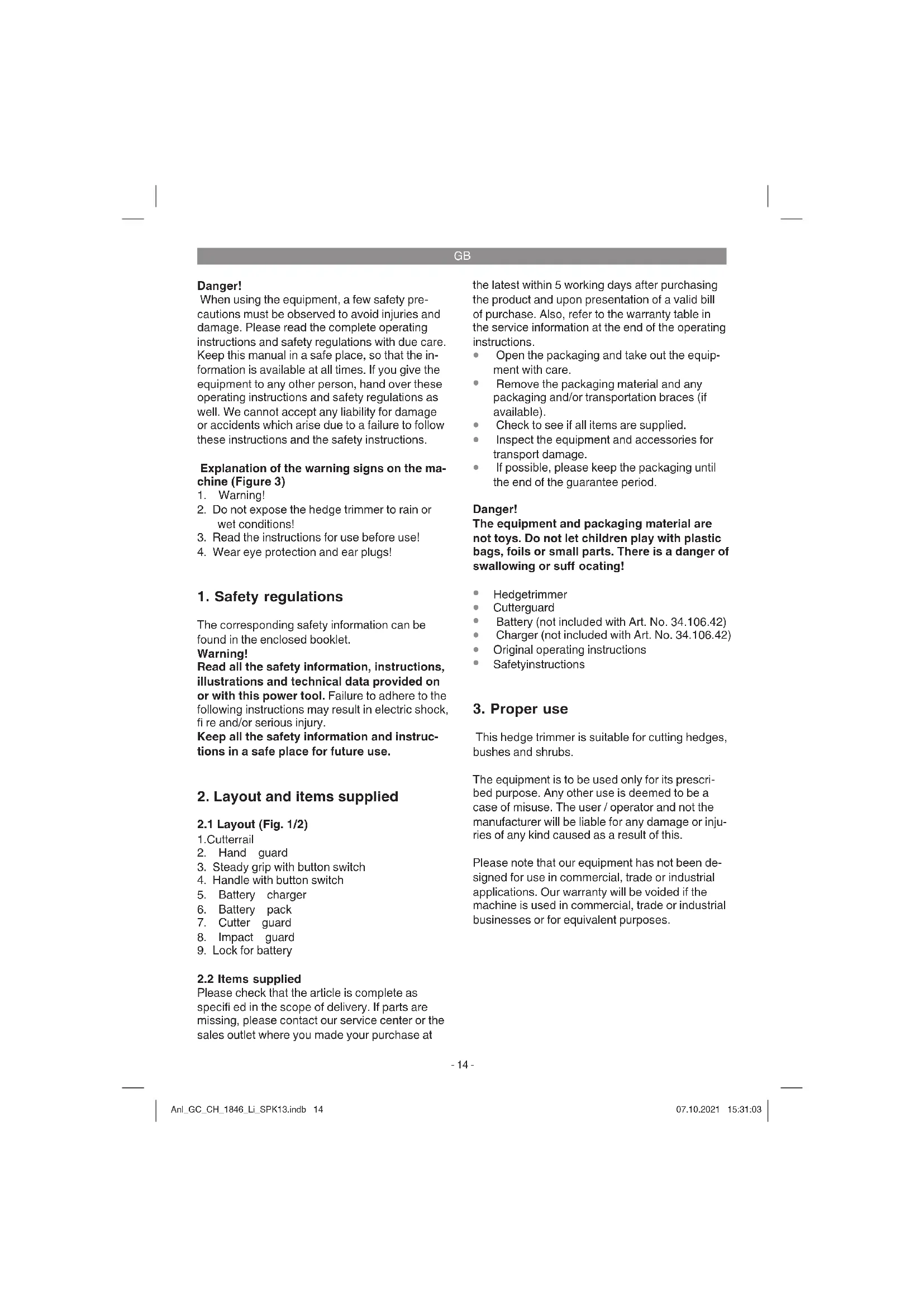 This hedge trimmer is suitable for cutting hedges, bushes and shrubs. The equipment is to be used only for its prescri- bed purpose. Any other use is deemed to be a case of misuse. The user / operator and not the manufacturer will be liable for any damage or inju- ries of any kind caused as a result of this. Please note that our equipment has not been de- signed for use in commercial, trade or industrial applications. Our warranty will be voided if the machine is used in commercial, trade or industrial businesses or for equivalent purposes. Anl_GC_CH_1846_Li_SPK13.indb 14Anl_GC_CH_1846_Li_SPK13.indb 14 07.10.2021 15:31:0307.10.2021 15:31:03GB