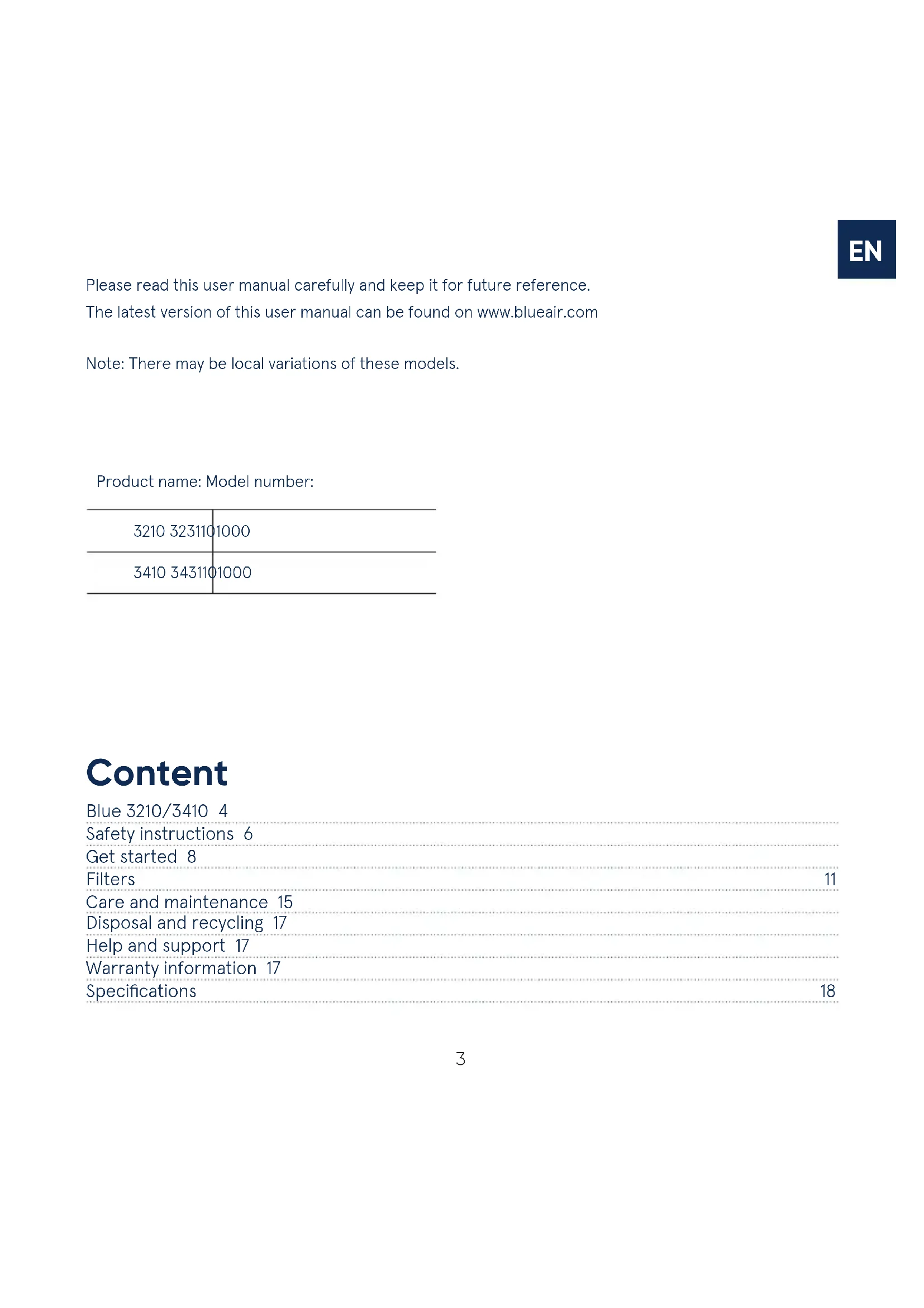 Blue 3210/3410 4 Safety instructions 6 Get started 8 Filters 11 Care and maintenance 15 Disposal and recycling 17 Help and support 17 Warranty information 17 Specifications 18 Content Please read this user manual carefully and keep it for future reference. The latest version of this user manual can be found on www.blueair.com Note: There may be local variations of these models. Product name: Model number: