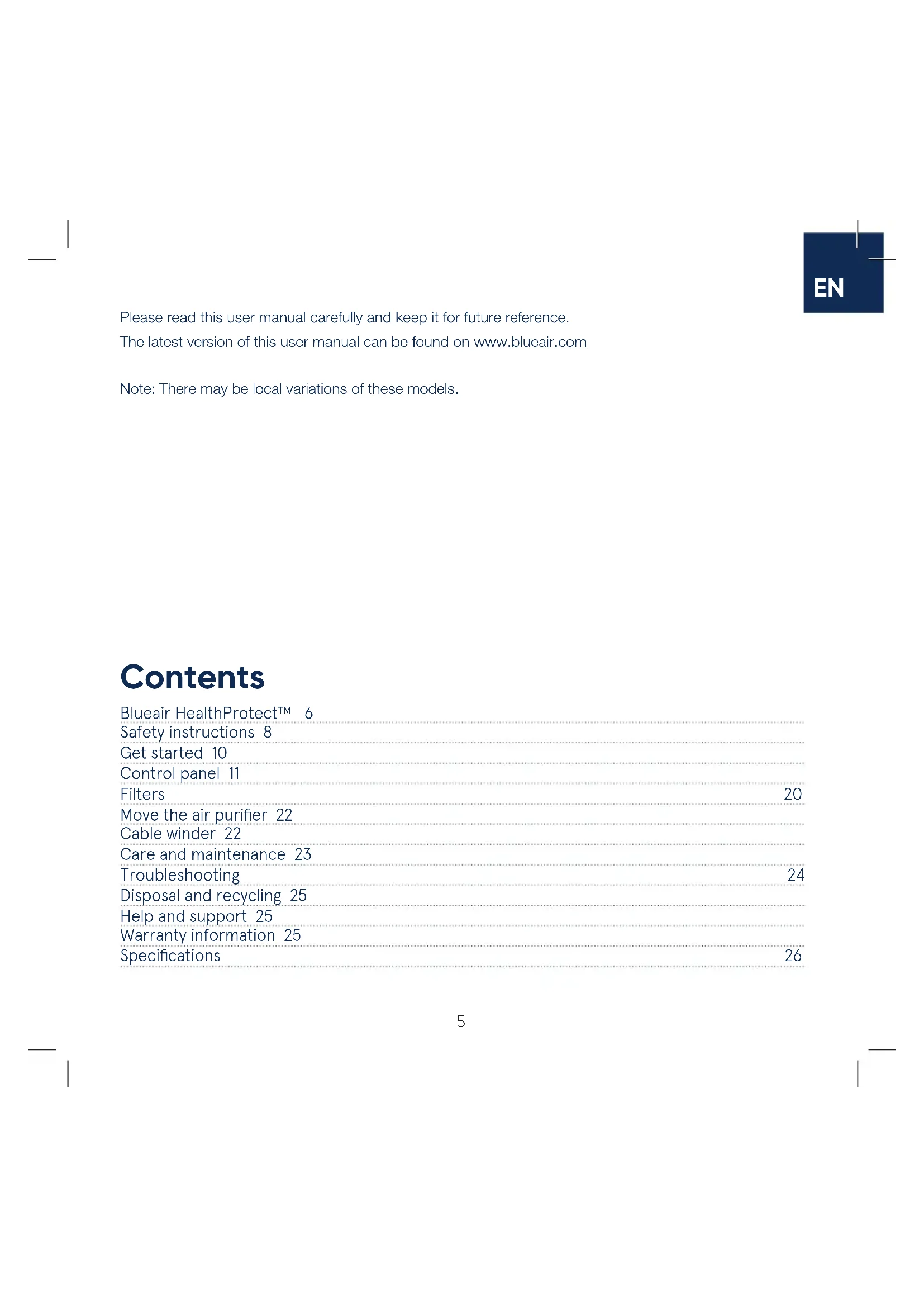 Blueair HealthProtect™ 6 Safety instructions 8 Get started 10 Control panel 11 Filters 20 Move the air purifier 22 Cable winder 22 Care and maintenance 23 Troubleshooting 24 Disposal and recycling 25 Help and support 25 Warranty information 25 Specifications 26 Contents Please read this user manual carefully and keep it for future reference. The latest version of this user manual can be found on www.blueair.com Note: There may be local variations of these models.6 Blueair HealthProtect™ Blueair HealthProtect™ air purifiers are available in three models, the 10-models, the 40-models and the 70-models. All models are Wi-Fi enabled, have a GermShield