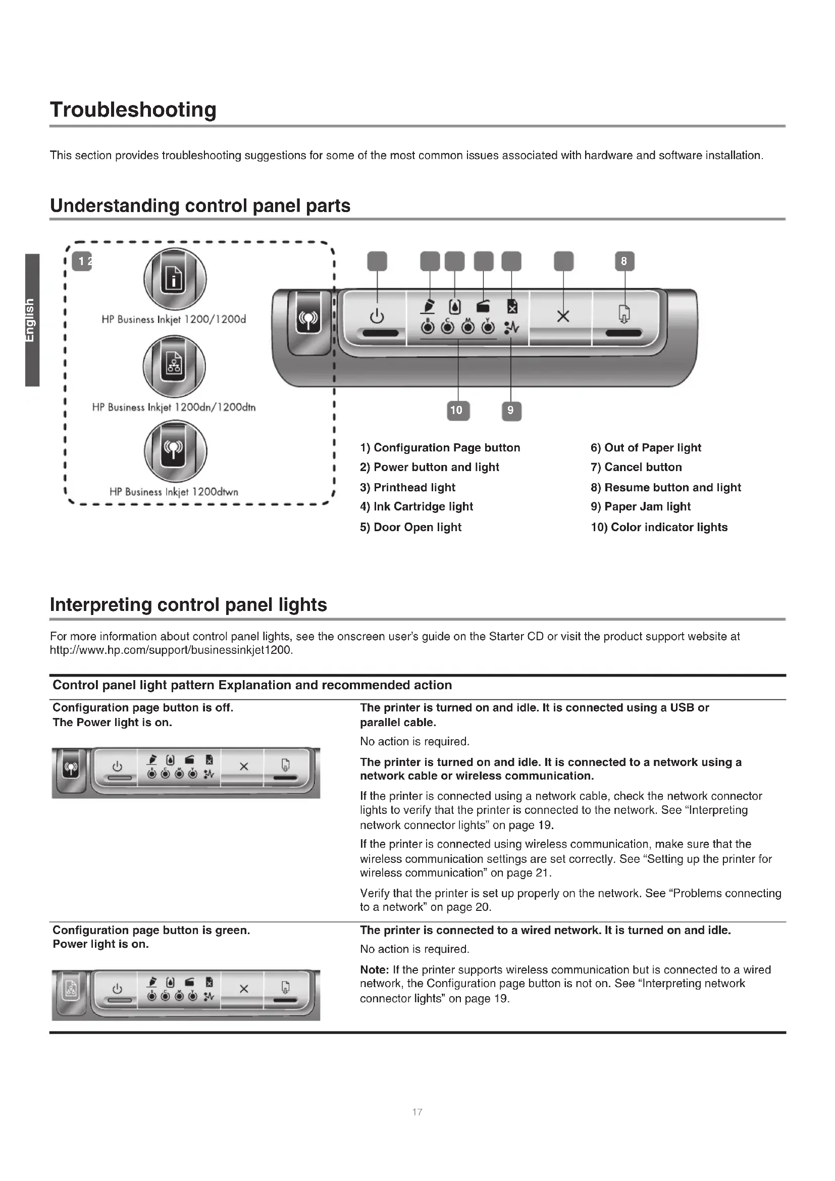 Control panel light pattern Explanation and recommended action Configuration page button is off. The Power light is on. The printer is turned on and idle. It is connected using a USB or parallel cable. No action is required. The printer is turned on and idle. It is connected to a network using a network cable or wireless communication. If the printer is connected using a network cable, check the network connector lights to verify that the printer is connected to the network. See “Interpreting network connector lights” on page 19. If the printer is connected using wireless communication, make sure that the wireless communication settings are set correctly. See “Setting up the printer for wireless communication” on page 21. Verify that the printer is set up properly on the network. See “Problems connecting to a network” on page 20. Configuration page button is green. Power light is on. The printer is connected to a wired network. It is turned on and idle. No action is required. Note: If the printer supports wireless communication but is connected to a wired network, the Configuration page button is not on. See “Interpreting network connector lights” on page 19. HPCrickMLK_GSG_UGFDIA.book Page 17 Wednesday, May 19, 2004 4:26 PM18 Configuration page button is blue. Power light is on. The printer is connected to a wireless network. It is turned on and idle. No action is required. Power light is on. Out of Paper light blinks. Resume light blinks. The printer is out of paper. Load paper in the printer, and then press (Resume button) to continue. Power light is on. Paper Jam light blinks. Resume light blinks. Paper is jammed in the printer. Clear the paper jam, and then press (Resume button) to continue. For more information, see the “Maintaining and troubleshooting” chapter in the onscreen user’s guide.” Power light is on. Door Open light is on. A cover is not closed completely. Make sure all covers are completely closed. Power light is on. Door Open light blinks. The rear-access panel or the auto-duplex unit is not inserted completely. Make sure the rear-access panel (HP Business Inkjet 1200) or the auto-duplex unit (HP Business Inkjet 1200d/1200dn/1200dtn/1200dtwn) is inserted completely in the back of the printer. Power light is on. Printhead light is on. The printhead latch is not secured properly. Open the top cover and press down firmly on the printhead latch to ensure that it is secured properly. Also, make sure the protective tape on each printhead has been removed. The Power light, the Ink Cartridge light, and one or more of the color indicator lights are on. One or more of the ink cartridges is missing. Install the ink cartridges and try to print. If the error persists, replace the ink cartridge or cartridges indicated. Power light is on. Printhead light and appropriate color indicator light blink. One or more of the printheads needs attention. Reinstall the printheads and try to print. Try cleaning the printhead contacts. See Maintaining the printheads. If the error persists, replace the printhead or printheads indicated. The Power light, the Printhead light, and one or more of the color indicator lights are on. One or more of the printheads is missing. Make sure that the protective tape on the printhead has been removed. Reinstall the printheads and try to print. HPCrickMLK_GSG_UGFDIA.book Page 18 Wednesday, May 19, 2004 4:26 PM19 English Understanding network connector parts Interpreting network connector lights Note: The printer’s wireless communication is turned off when the printer is connected using a network cable. Power light is on. One or more color indicator lights is on. One or more ink cartridges is low on ink and will need to be replaced soon. No action is required. Power light is on. One or more color indicator lights blinks. An ink cartridge is out of ink and must be replaced before you can continue printing. Replace the ink cartridge indicated.