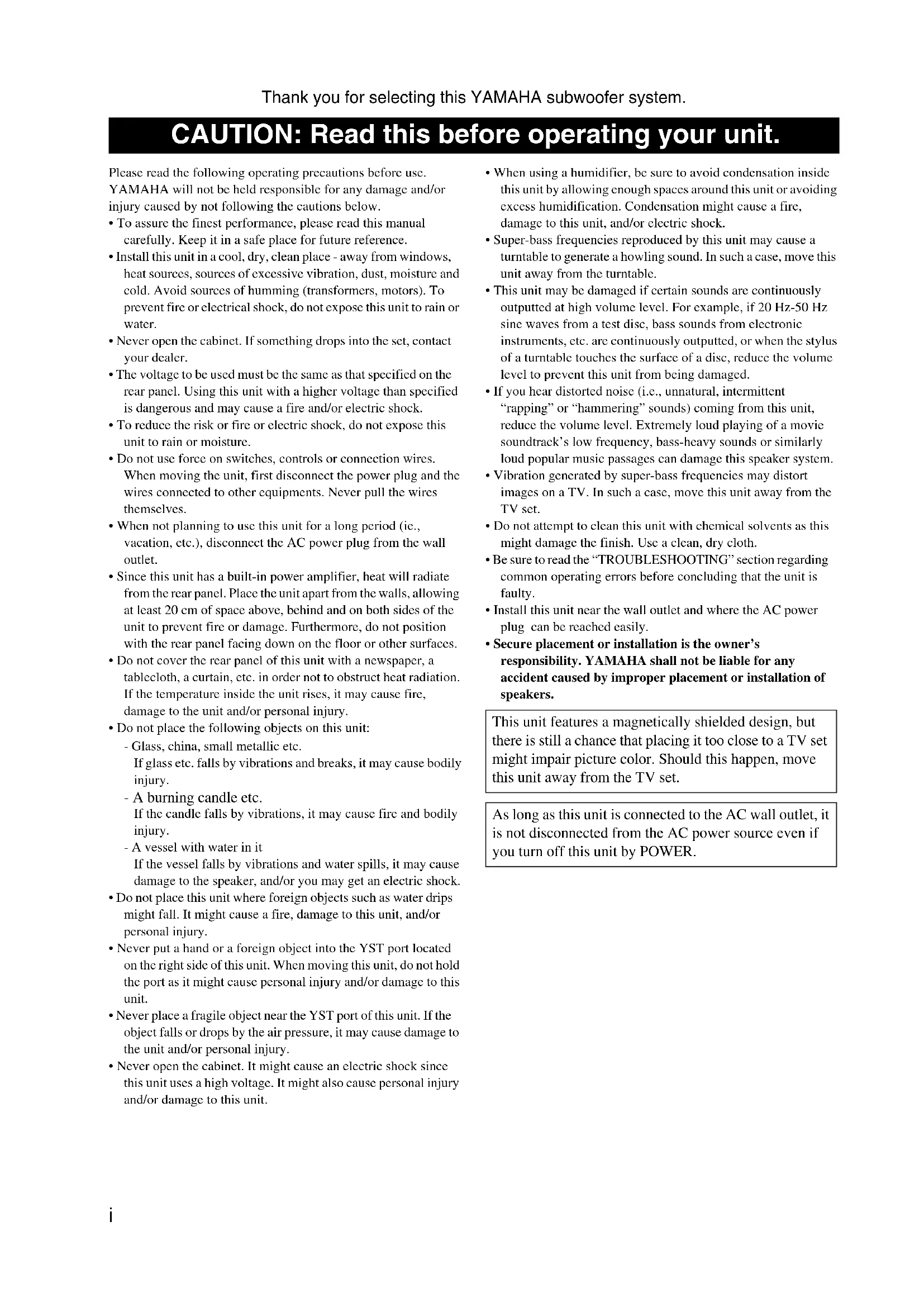 - Secure placement or installation is the owner’s responsibility. YAMAHA shall not be liable for any accident caused by improper placement or installation of speakers. CAUTION: Read this before operating your unit. This unit features a magnetically shielded design, but there is still a chance that placing it too close to a TV set might impair picture color. Should this happen, move this unit away from the TV set. As long as this unit is connected to the AC wall outlet, it is not disconnected from the AC power source even if you turn off this unit by POWER.1 English