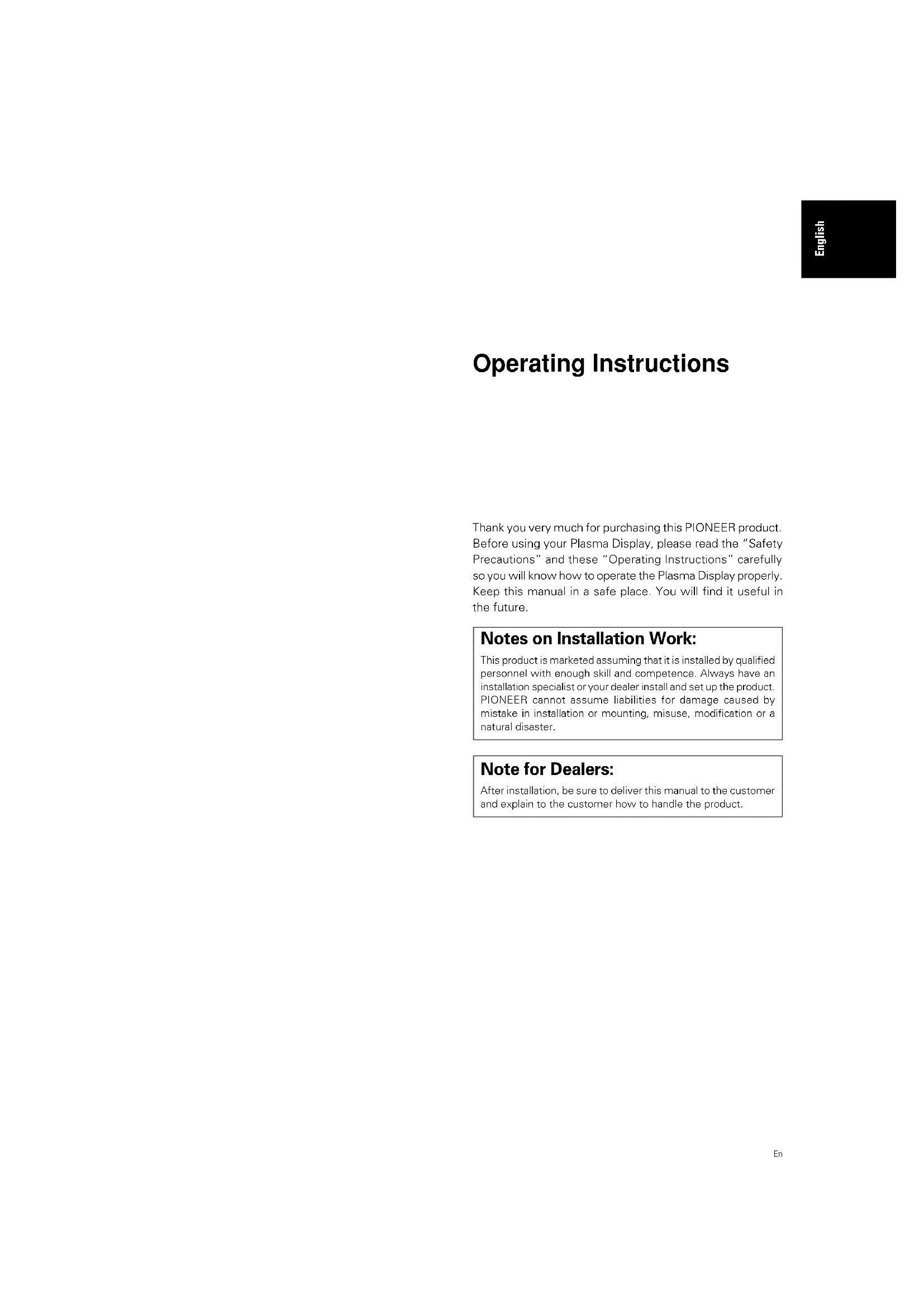 Safety Precautions Français English Operating Instructions Thank you very much for purchasing this PIONEER product. Before using your Plasma Display, please read the “Safety Precautions” and these “Operating Instructions” carefully so you will know how to operate the Plasma Display properly. Keep this manual in a safe place. You will find it useful in the future. Notes on Installation Work: This product is marketed assuming that it is installed by qualified personnel with enough skill and competence. Always have an installation specialist or your dealer install and set up the product. PIONEER cannot assume liabilities for damage caused by mistake in installation or mounting, misuse, modification or a natural disaster. Note for Dealers: After installation, be sure to deliver this manual to the customer and explain to the customer how to handle the product.ii