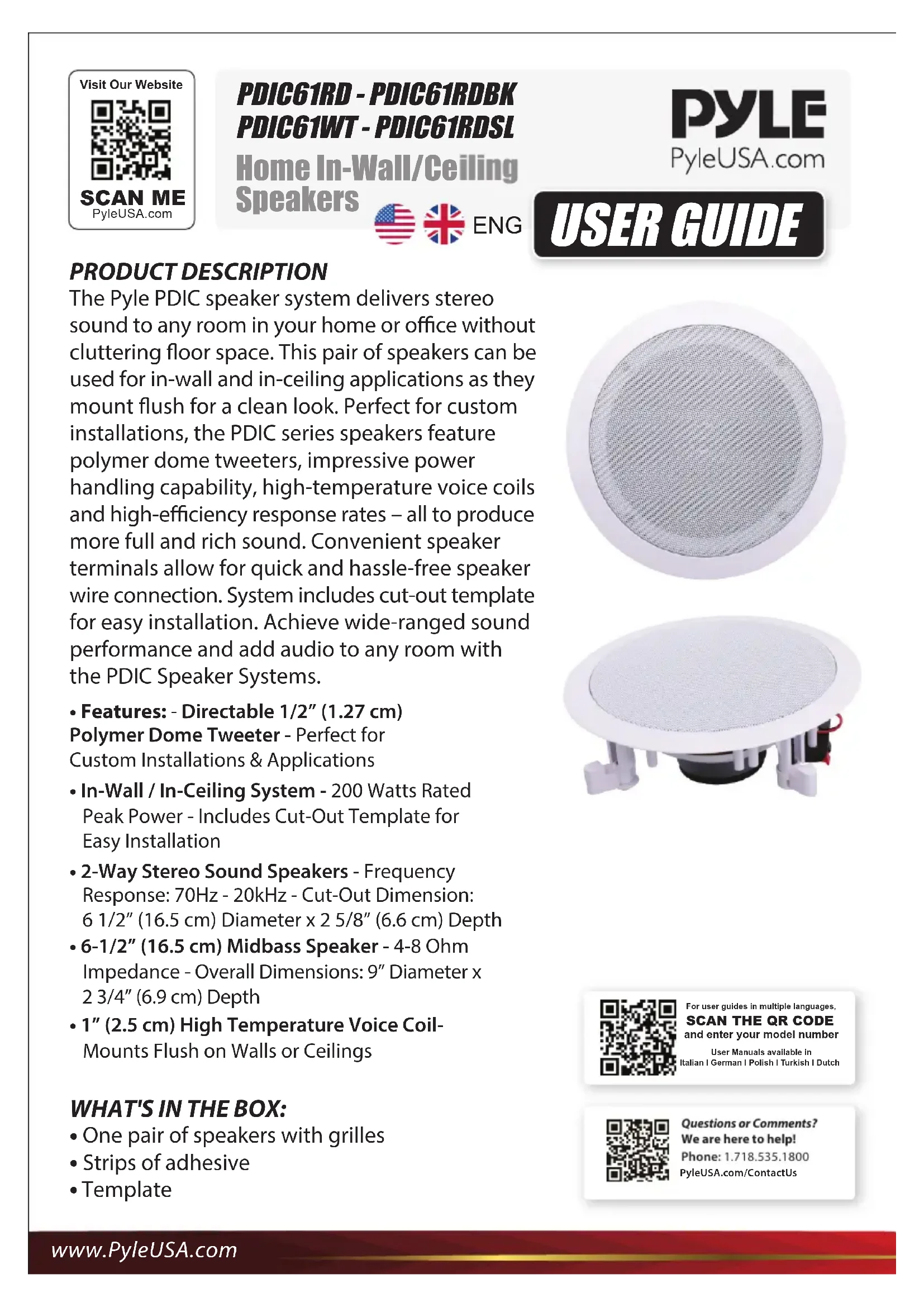 - 1” (2.5 cm) High Temperature Voice Coil- Mounts Flush on Walls or Ceilings• 6-1/2” (16.5 cm) Midbass Speaker - 4-8 Ohm Impedance - Overall Dimensions: 9” Diameter x 2 3/4” (6.9 cm) Depth• 2-Way Stereo Sound Speakers - Frequency Response: 70Hz - 20kHz - Cut-Out Dimension: 6 1/2” (16.5 cm) Diameter x 2 5/8” (6.6 cm) Depth• In-Wall / In-Ceiling System - 200 Watts Rated Peak Power - Includes Cut-Out Template for Easy Installation• Features: - Directable 1/2” (1.27 cm)Polymer Dome Tweeter - Perfect for Custom Installations & ApplicationsThe Pyle PDIC speaker system delivers stereo sound to any room in your home or oce without cluttering oor space. This pair of speakers can be used for in-wall and in-ceiling applications as they mount ush for a clean look. Perfect for custom installations, the PDIC series speakers feature polymer dome tweeters, impressive power handling capability, high-temperature voice coils and high-eciency response rates – all to produce more full and rich sound. Convenient speaker terminals allow for quick and hassle-free speaker wire connection. System includes cut-out template for easy installation. Achieve wide-ranged sound performance and add audio to any room with the PDIC Speaker Systems. ENG
