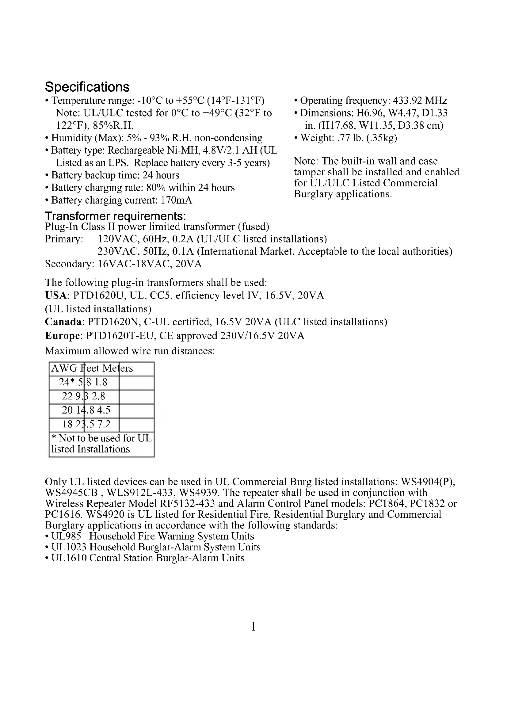 - Weight: .77 lb. (.35kg) Note: The built-in wall and case tamper shall be installed and enabled for UL/ULC Listed Commercial Burglary applications. Transformer requirements: Plug-In Class II power limited transformer (fused) Primary: 120VAC, 60Hz, 0.2A (UL/ULC listed installations) 230VAC, 50Hz, 0.1A (International Market. Acceptable to the local authorities) Secondary: 16VAC-18VAC, 20VA The following plug-in transformers shall be used: USA: PTD1620U, UL, CC5, efficiency level IV, 16.5V, 20VA (UL listed installations) Canada: PTD1620N, C-UL certified, 16.5V 20VA (ULC listed installations) Europe: PTD1620T-EU, CE approved 230V/16.5V 20VA Maximum allowed wire run distances: Only UL listed devices can be used in UL Commercial Burg listed installations: WS4904(P), WS4945CB , WLS912L-433, WS4939. The repeater shall be used in conjunction with Wireless Repeater Model RF5132-433 and Alarm Control Panel models: PC1864, PC1832 or PC1616. WS4920 is UL listed for Residential Fire, Residential Burglary and Commercial Burglary applications in accordance with the following standards: