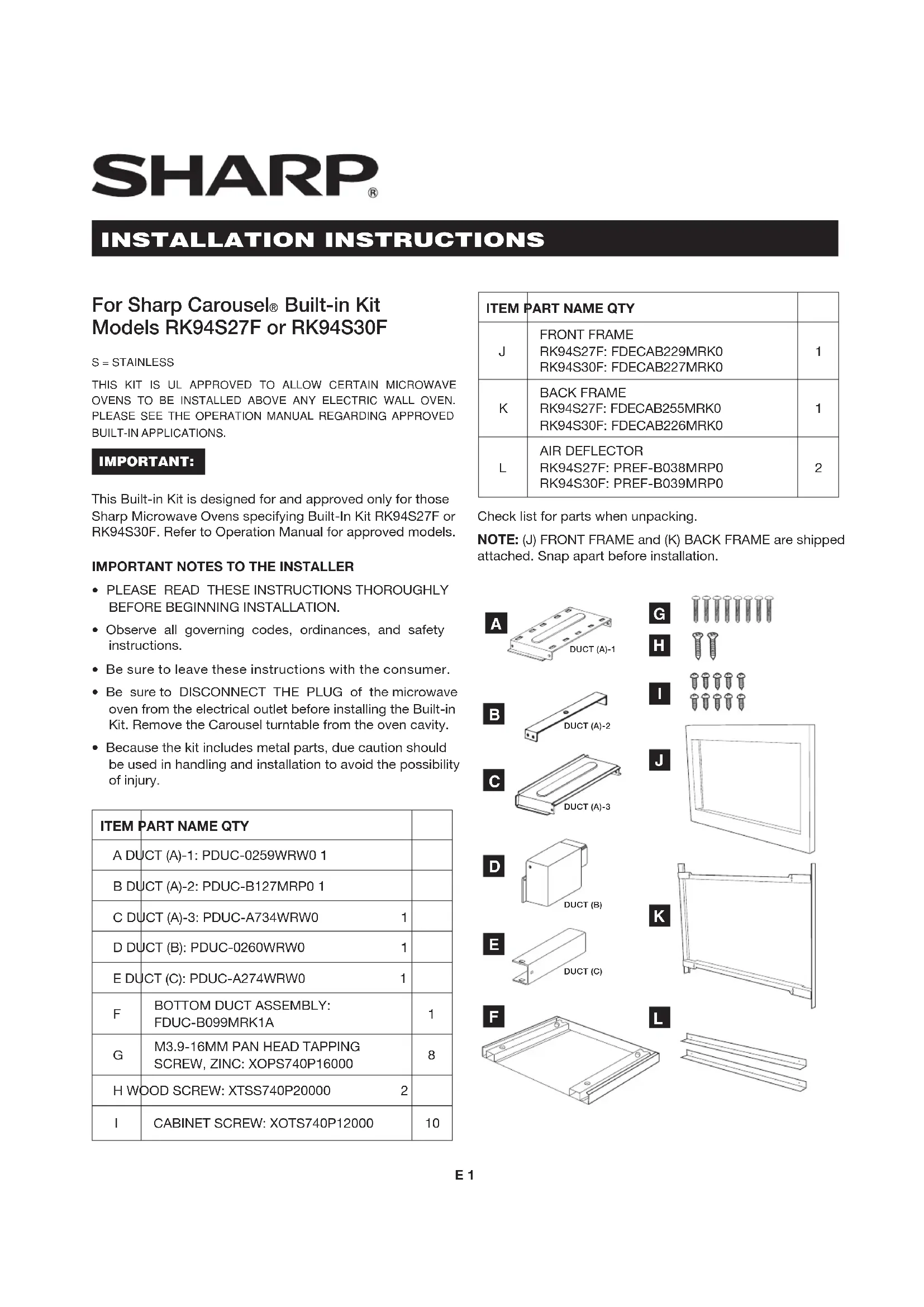 Built-in Kit Models RK94S27F or RK94S30F S = STAINLESS THIS KIT IS UL APPROVED TO ALLOW CERTAIN MICROWAVE OVENS TO BE INSTALLED ABOVE ANY ELECTRIC WALL OVEN. PLEASE SEE THE OPERATION MANUAL REGARDING APPROVED BUILT-IN APPLICATIONS. IMPORTANT: This Built-in Kit is designed for and approved only for those Sharp Microwave Ovens specifying Built-In Kit RK94S27F or RK94S30F. Refer to Operation Manual for approved models.