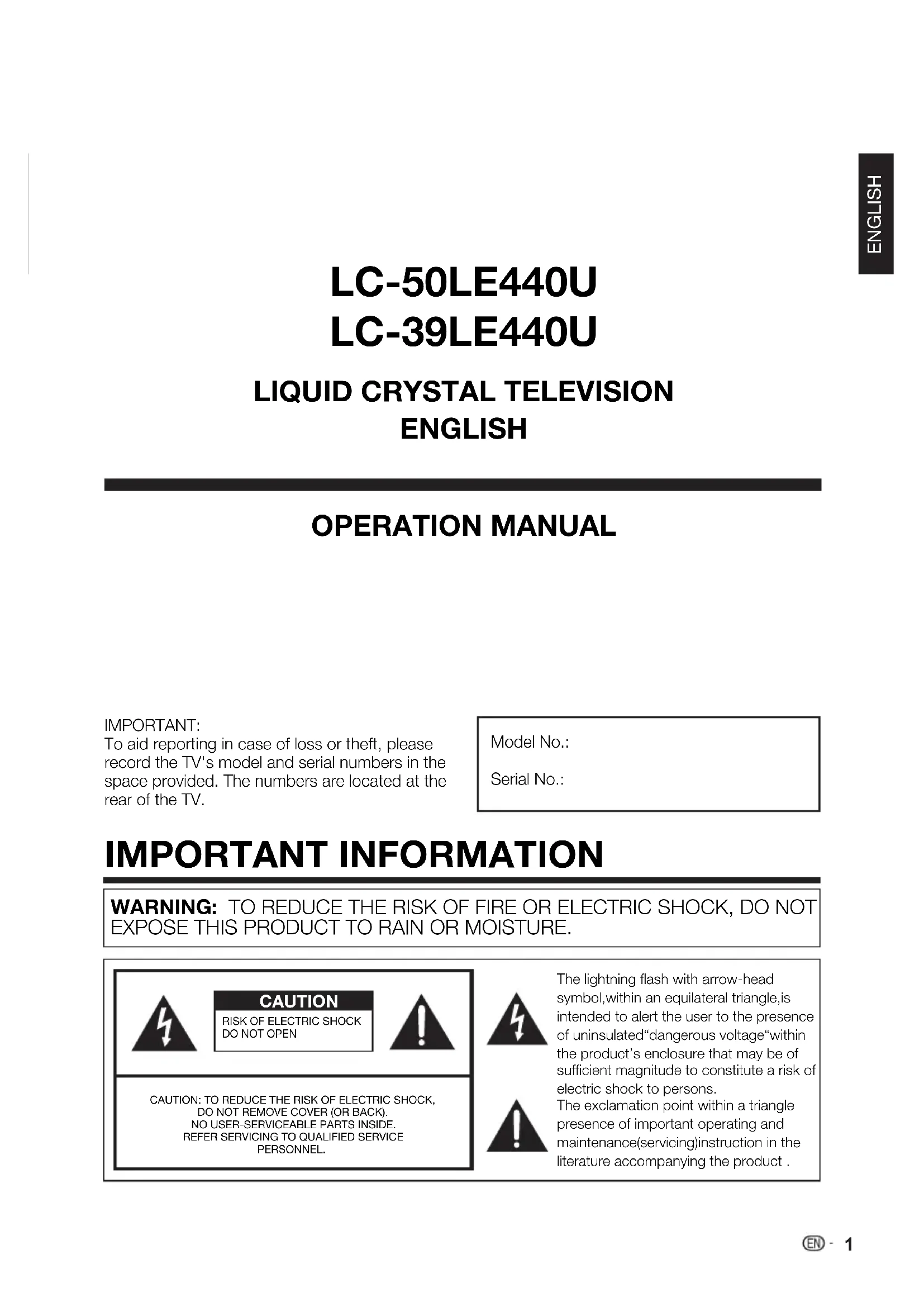 equipment not expressly approved by the manufacturer could void the user’s authority to operate this equipment. CAUTION: This product satisfies FCC regulations when shielded cables and connectors are used to connect the unit to other equipment. To prevent electromagnetic interference with electric appliances such as radios and televisions, use shielded cables and connectors for connections. CAUTION: TO PREVENT ELECTRIC SHOCK,MATCH WIDE BLADE OF PLUG TO WIDE SLOT, FULLY INSERT. DECLARATION OF CONFORMITY: SHARP LIQUID CRYSTAL TELEVISION, MODEL LC-50LE440U / LC-39LE440U This device complies with Part 15 of the FCC Rules. Operation is subject to the following two conditions: (1) This device may not cause harmful interference, and (2) this device must accept any interference received, including interference that may cause undesired operation. RESPONSIBLE PARTY: