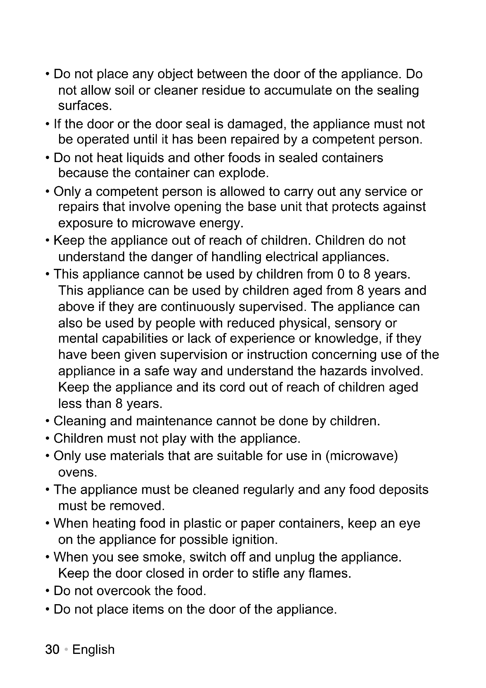 - Do not attempt to operate the appliance with the door open. This can result in harmful exposure to microwave energy. English