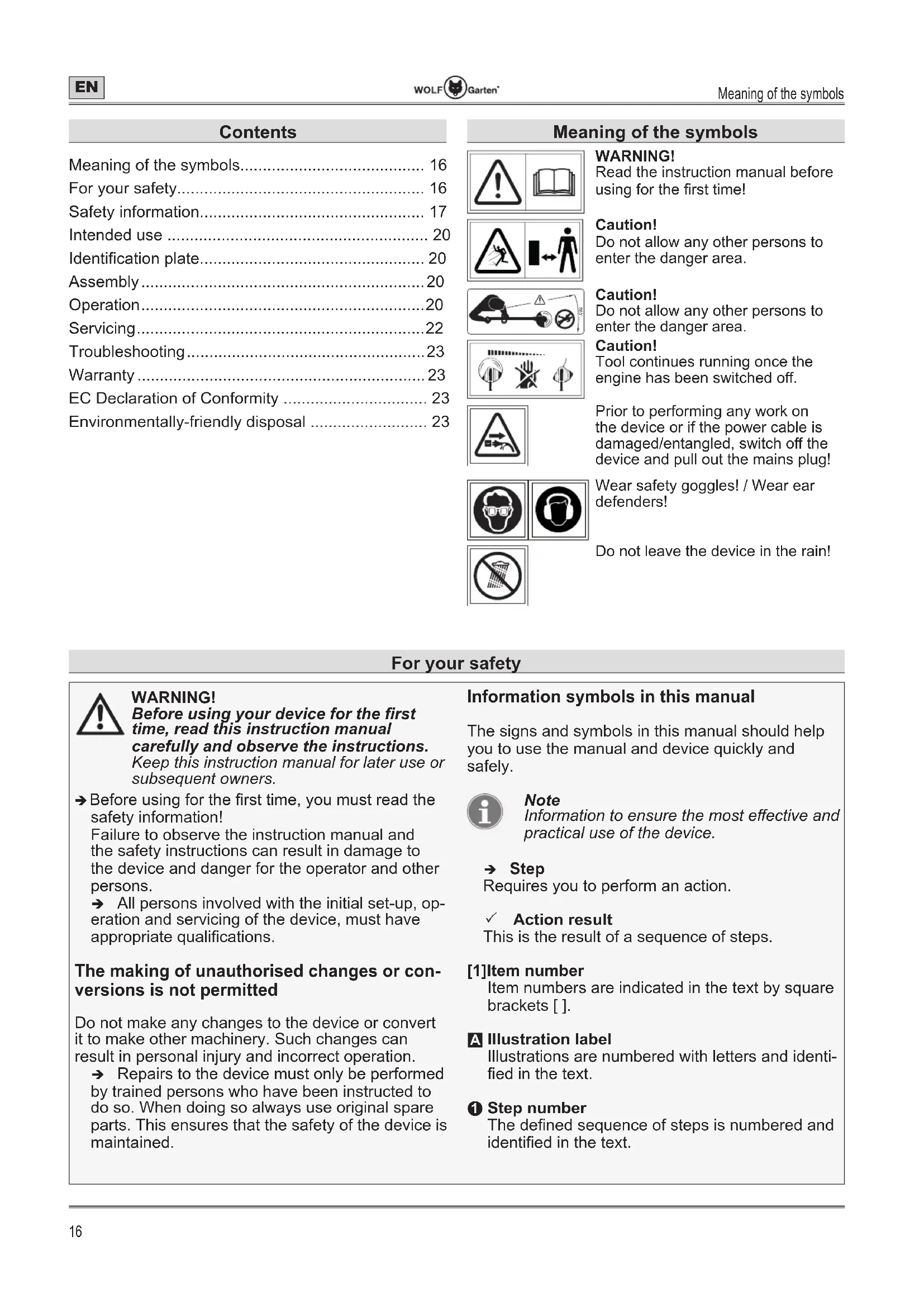 Safety information Danger levels of warning information The following danger levels are used in this instruc- tion manual to indicate potentially dangerous situations: DANGER ! A dangerous situation is highly likely and, if the measures are not followed, will result in severe injury and even death. WARNING! A dangerous situation may occur and, if the measures are not followed, will result in severe injury and even death. CAUTION! A dangerous situation may occur and, if the measures are not followed, will result in slight or minor injuries. Attention! A possibly harmful situation may occur which if not avoided will result in property damage. Safety information content DANGER ! Type and source of the danger! ÂConsequences of non-observation ¾ Measure for preventing the danger Safety information Protection of yourself and others ¾ This device must not be used by children under 16 years of age or persons with reduced physical, sensory or mental capabilities or with inadequate experience or insuႈcient knowledge. Likewise persons must be familiar with this instruction manual before using the device. The minimum age for using the device may be speci¿ed by local or national legislation. ¾ For safety reasons, children under 16 years of age or persons who are not familiar with the usage instructions must not use the trimmer. The minimum age of users may be de¿ned by local or national legislation. ¾ Do not operate the trimmer when there are people (especially children) or animals in the immediate vicinity. Ensure children do not play with the trimmer. ¾ Stop using the device if persons (especially children) or animals are nearby. ¾ Only switch the motor on if your feet and hands are at a safe distance from the cutting element. ¾ Always disconnect the device from the power supply if you are leaving it unattended or removing a blockage. ¾ Always wear sturdy shoes and long trousers as well as other appropriate personal protective equipment (safety glasses, ear defenders, safety gloves etc.) when working with the trimmer. The wearing of personal protective equipment minimises the risk of injury. Do not wear loose clothing, etc., which could be caught by the cutting tool. Before use ¾ Before use, make sure you are familiar with the trimmer, its functions and controls. ¾ Never ¿t metallic cutting elements. ¾ Do not use any trimmer whose switch is defective and which can no longer be switched on or oႇ. It must be repaired by a quali¿ed expert or workshop.Safety information