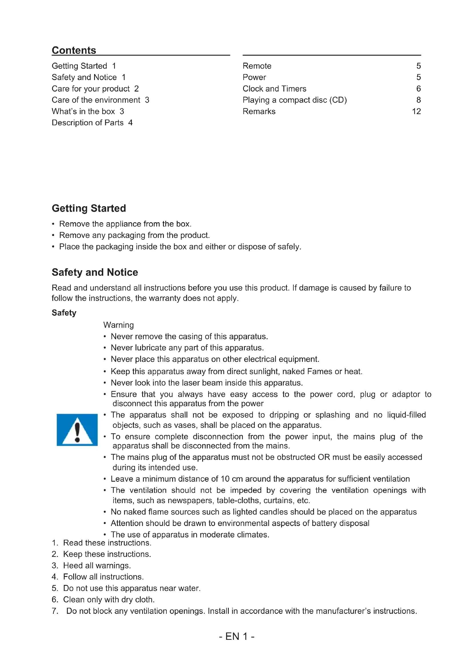 Getting Started 1 Safety and Notice 1 Care for your product 2 Care of the environment 3 What’s in the box 3 Description of Parts 4 Remote 5 Power 5 Clock and Timers 6 Playing a compact disc (CD) 8 Remarks: 12